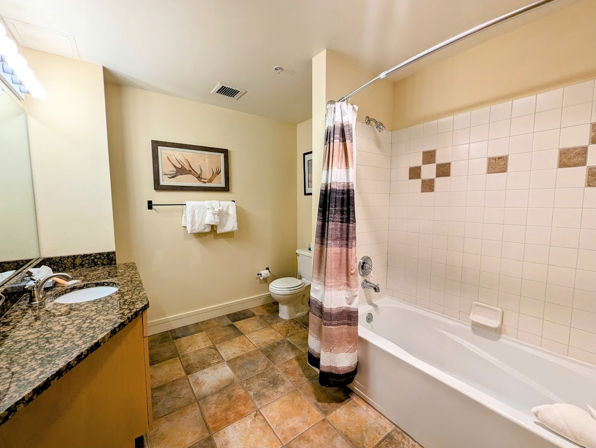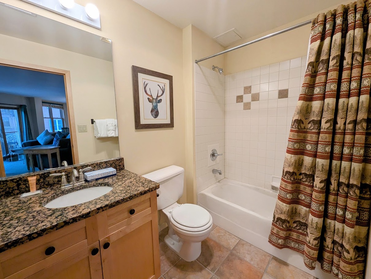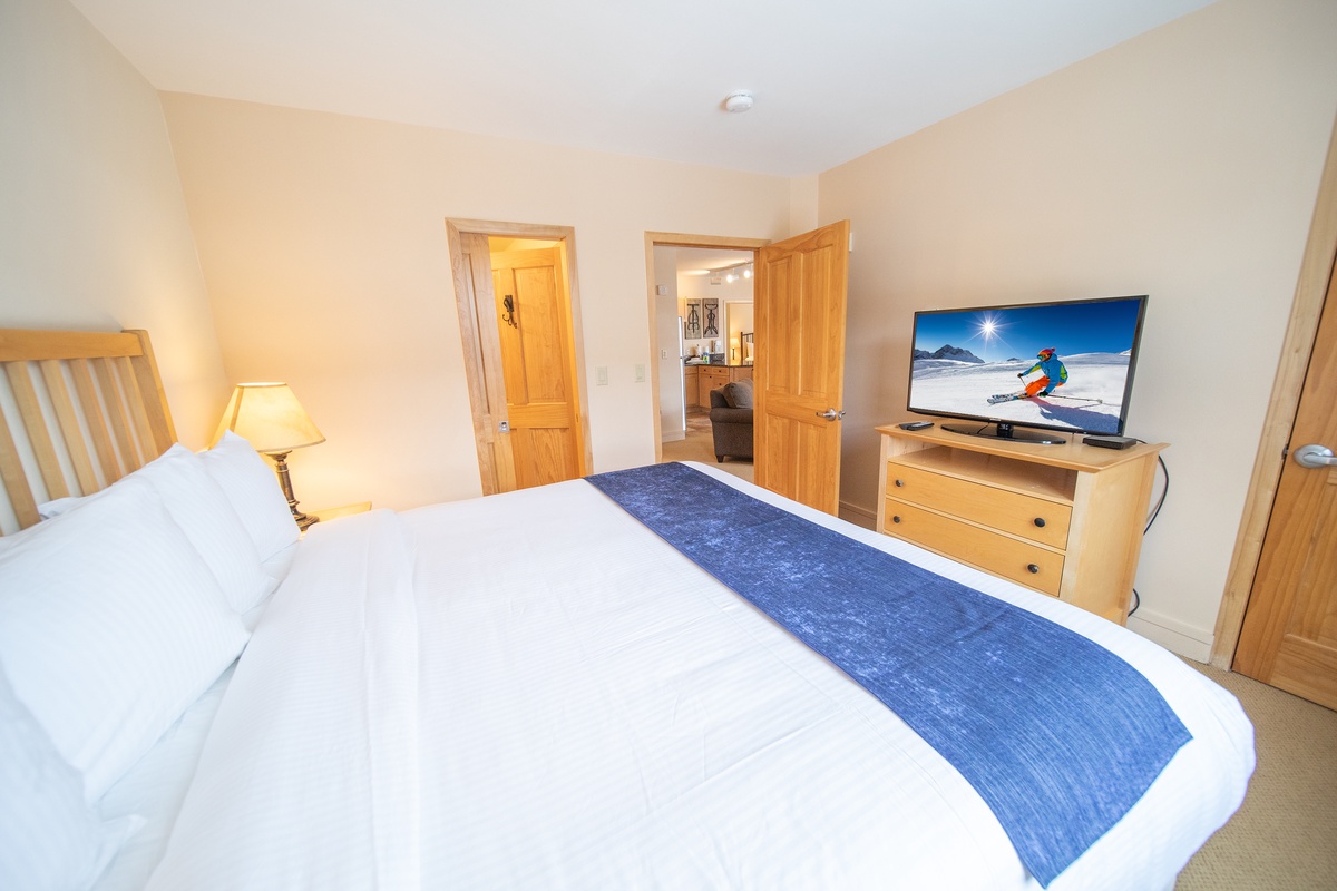 Upon entering, the inviting living area with a gas fireplace invites you to unwind. Large windows fill the space with natural light, while the private upper-level balcony offers panoramic mountain views and fresh mountain air. The open-concept layout is ideal for gathering and sharing stories of the day's adventures.