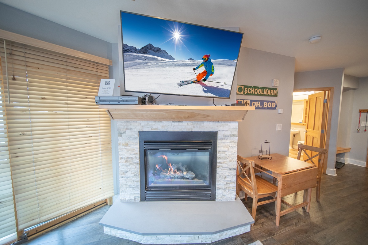 The living room is a tranquil sanctuary featuring an inviting fireplace, a large flat-screen tv, and windows that flood the space with natural light, revealing stunning mountain vistas and courtyard views. The area is an ideal place to unwind after a day of adventures, either by curling up with a good book in front of the roaring fire or by watching a movie for movie night.