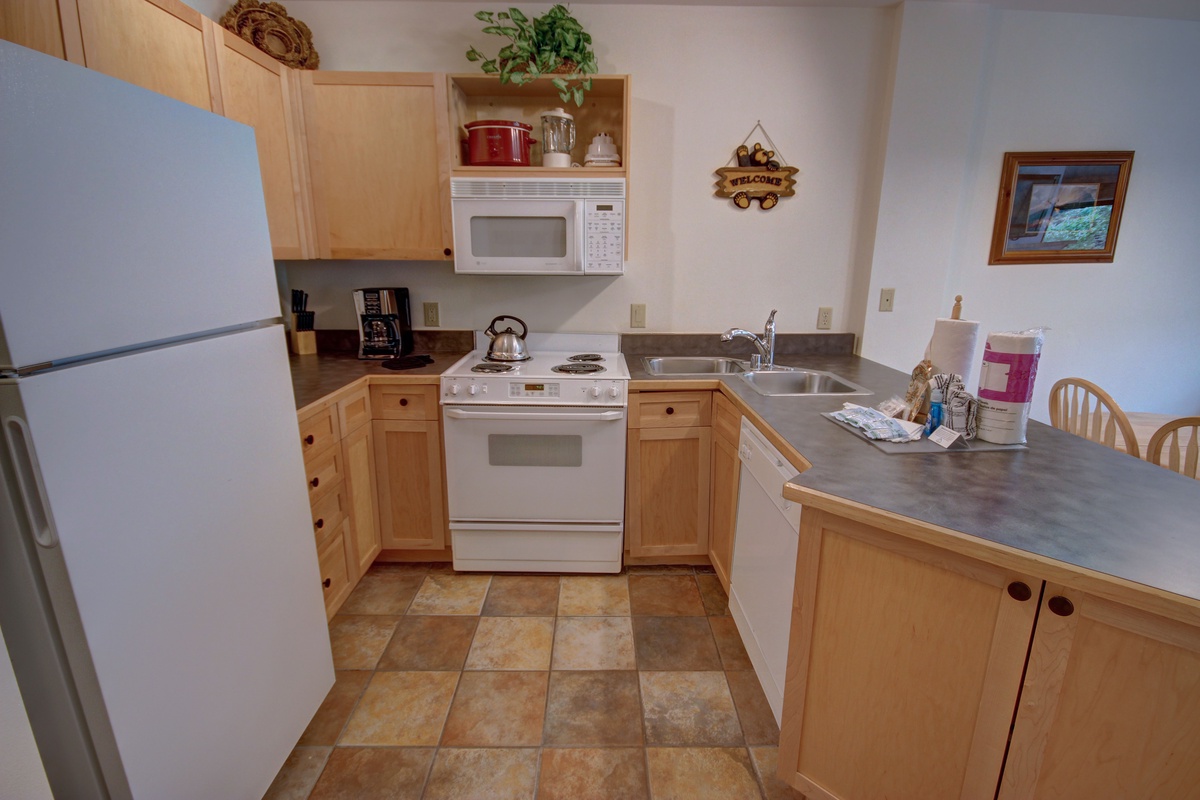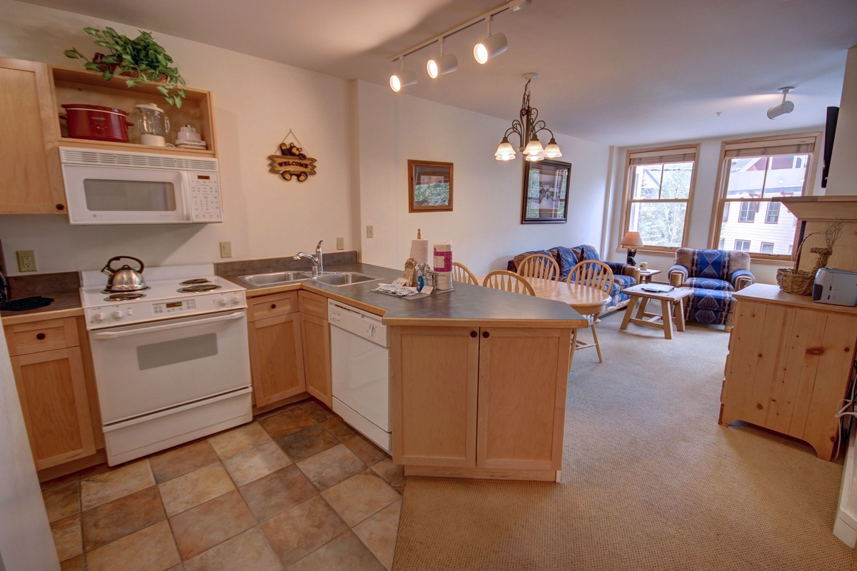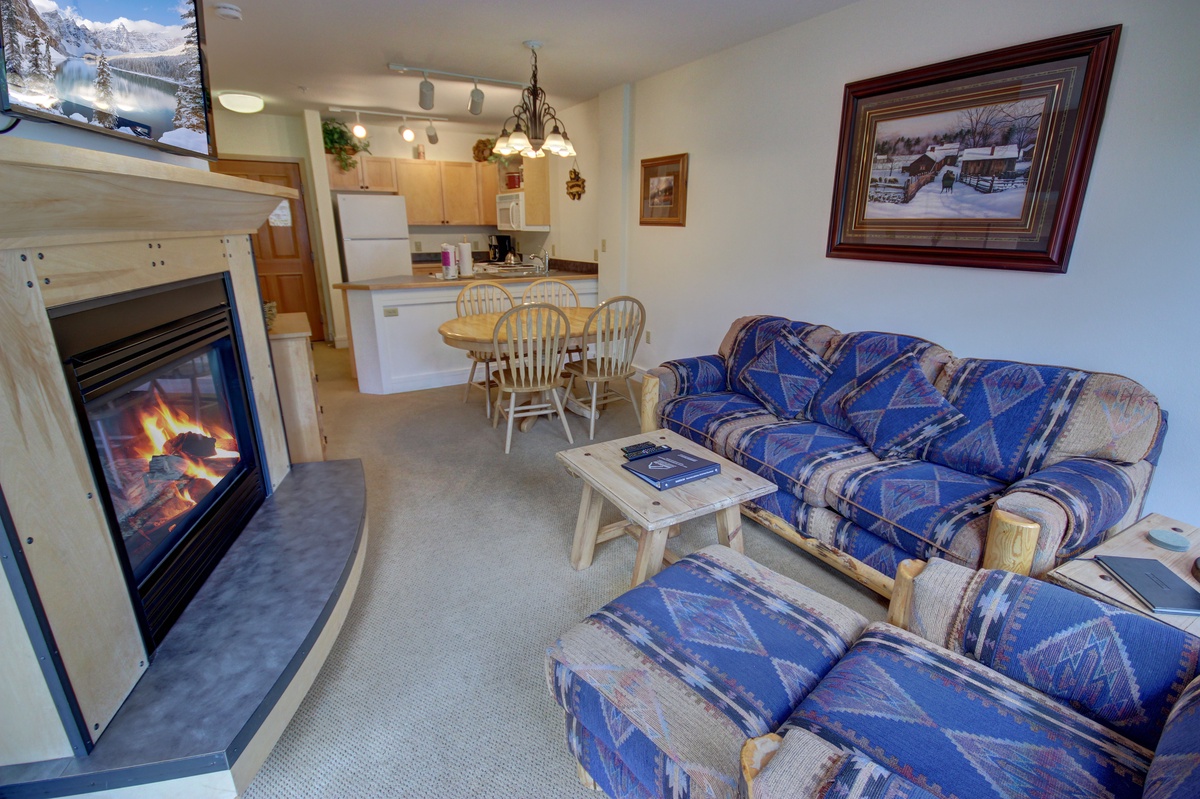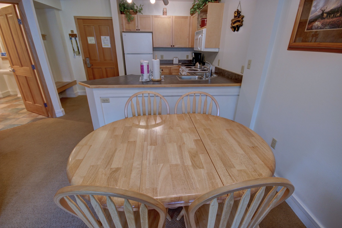 The kitchen features modern appliances and ample countertop space, allowing you to whip up your favorite meals with ease. The tasteful wooden cabinetry complements the condo's mountain lodge ambiance. The adjacent dining area is equipped with a comfortable seating arrangement, making it a wonderful spot for intimate dinners or game nights.