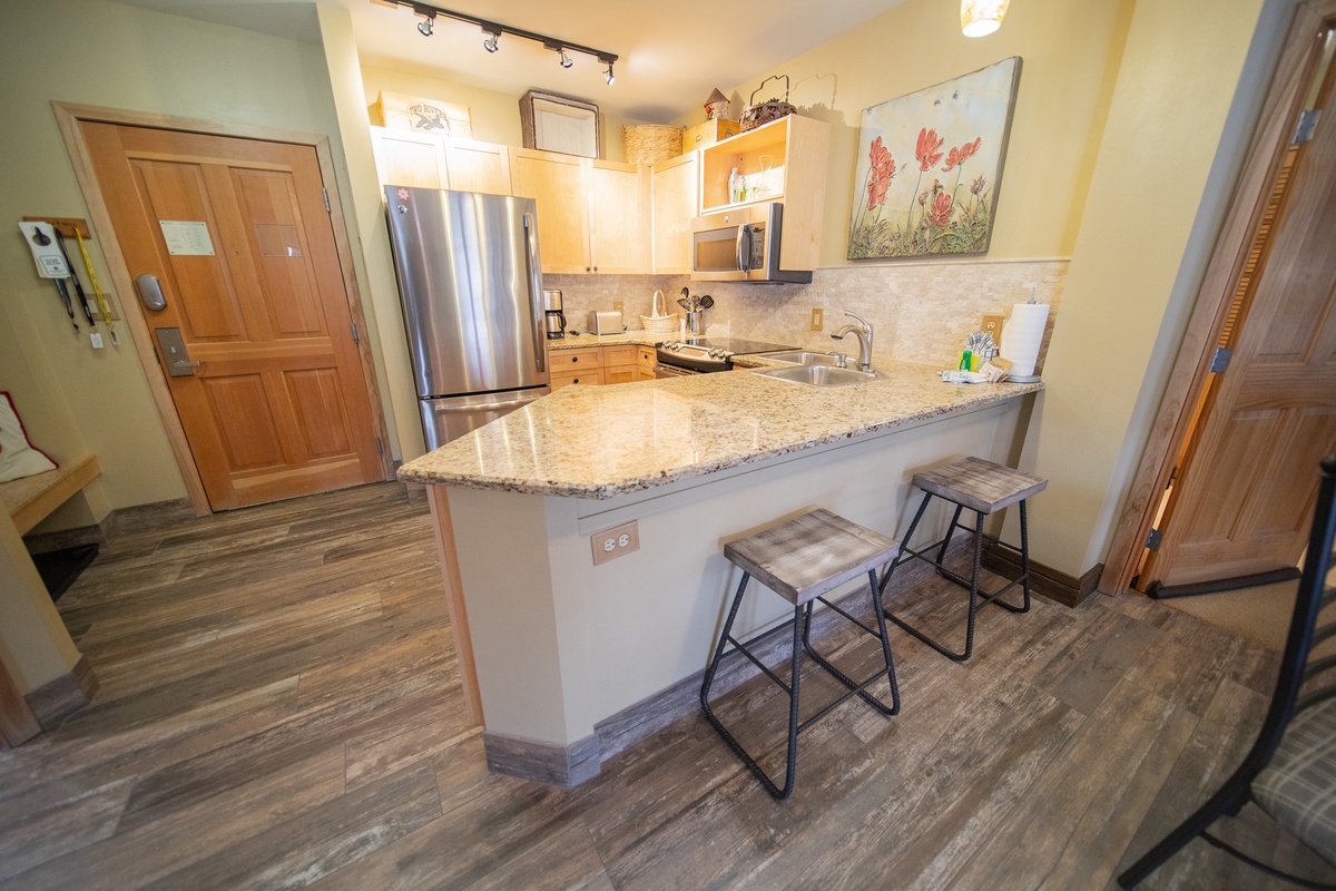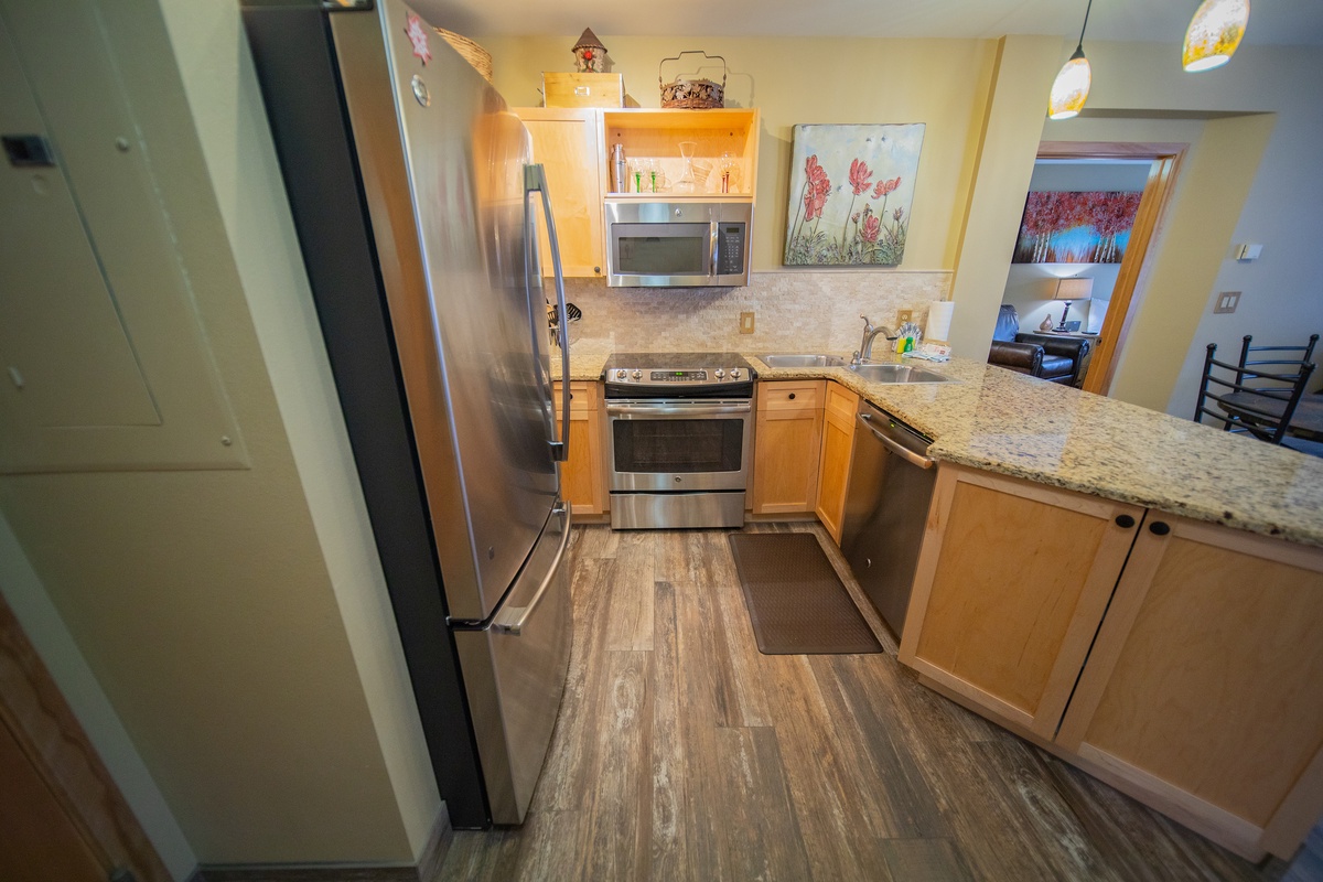 The condo's kitchen is a dream for any chef in your party. Its modern, fully-equipped design boasts stainless steel appliances and a generous granite countertop, ideal for preparing meals and entertaining. The breakfast bar and dining area offer plenty of seating for everyone, ensuring a delightful shared dining experience amidst the tranquil ambiance.