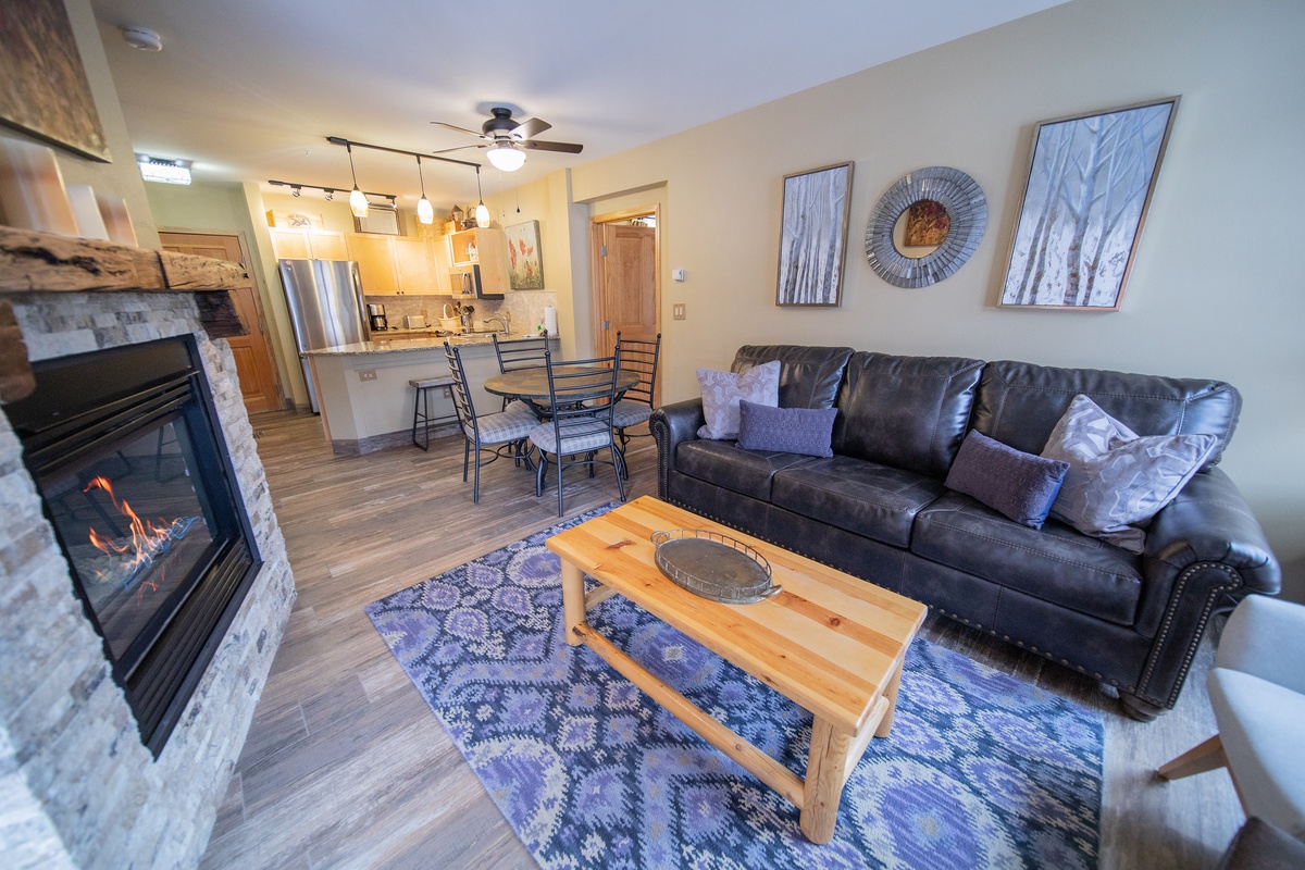 Upon entering, the warmth of the spacious open-plan living area instantly invites relaxation. This inviting space is accentuated by the large windows that flood the room with an abundance of natural light, reflecting off the tasteful mountain-inspired decor and rustic hardwood flooring. Settle into the plush, comfortable furnishings and enjoy a cozy night in front of the fireplace, or step out onto the private balcony to breathe in the crisp mountain air and marvel at the stunning views.