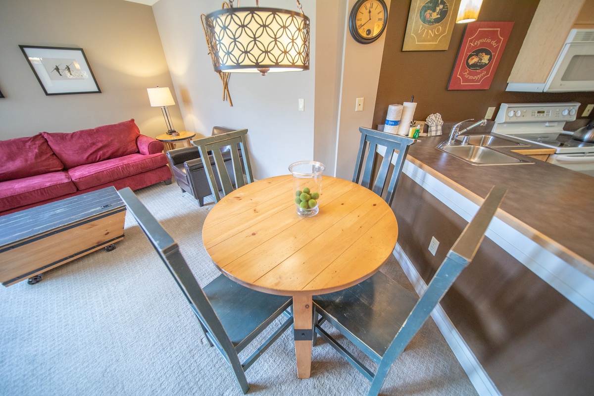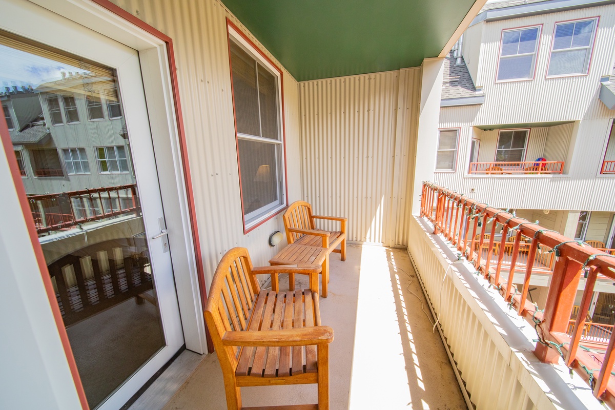 In the adjoining kitchen, find everything you need to whip up a hearty breakfast before a day on the slopes or prepare a delicious dinner after your mountain adventures. Equipped with modern appliances and ample counter space, this kitchen is as practical as it is inviting. Step outside onto the private balcony to soak in the stunning mountain vistas and crisp Colorado air, complete with comfortable outdoor seating - the perfect spot for your morning coffee or an evening nightcap.