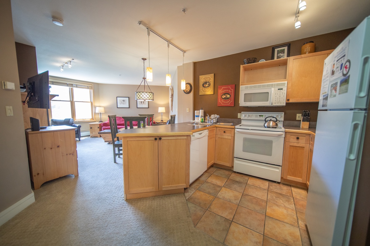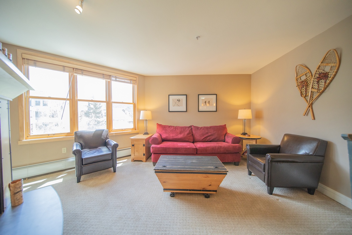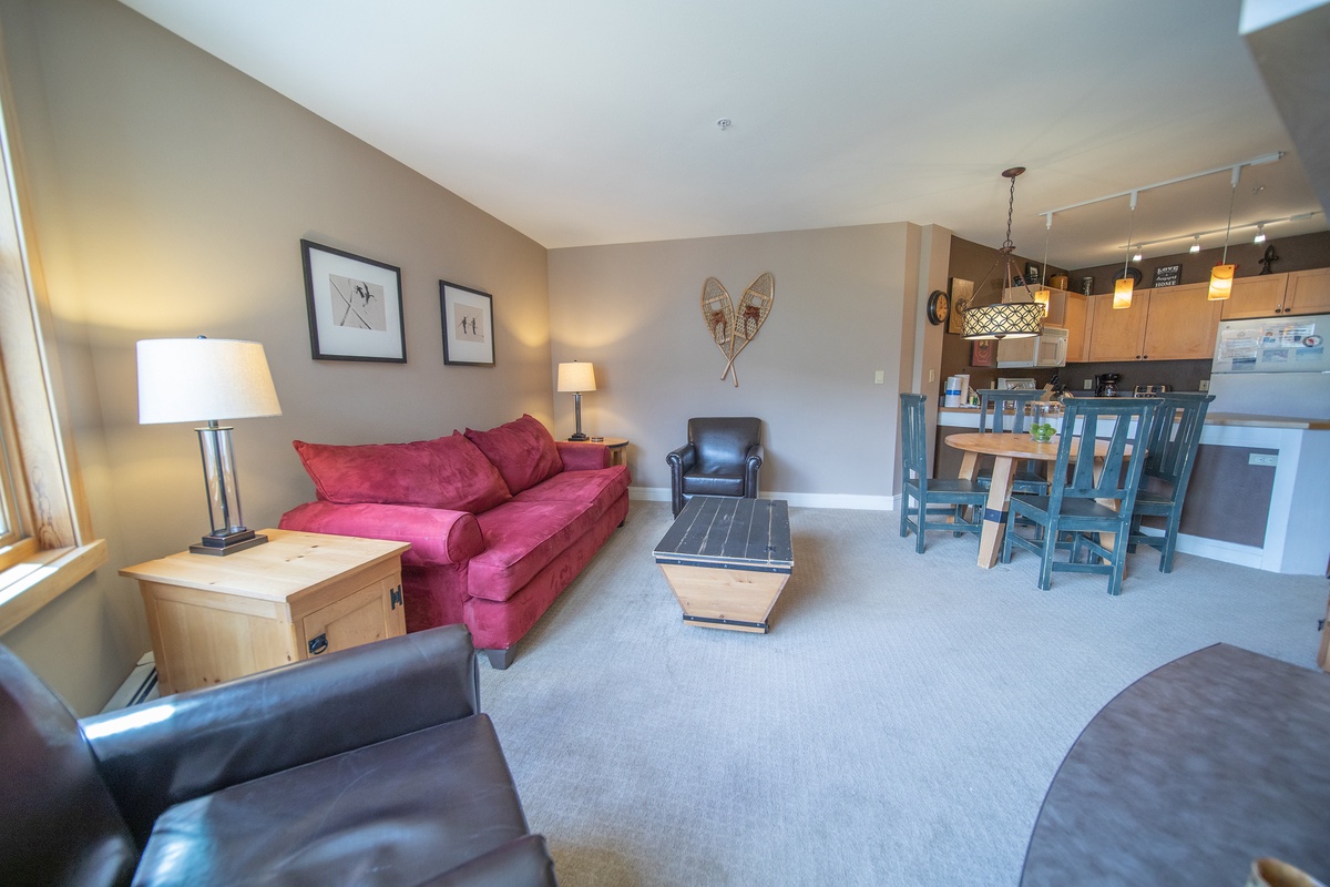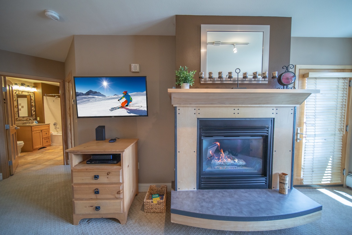 Upon entering the condo, you're immediately greeted by the open floor plan that combines the living, dining, and kitchen areas, creating a seamless flow perfect for relaxation and entertainment. The living room, adorned with plush furnishings and a crackling fireplace, beckons you to unwind with a good book or enjoy a movie night on the flat-screen TV.
