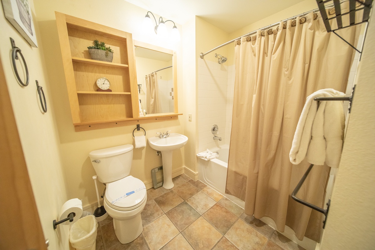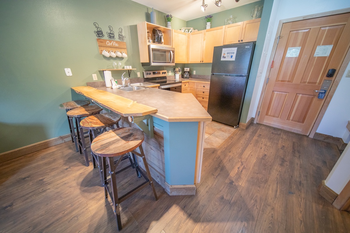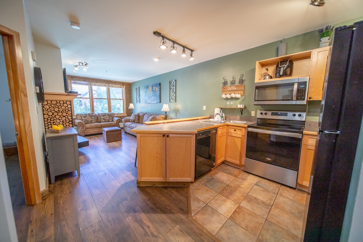 Upon entering, you are greeted by a welcoming living area that instantly sets a tranquil tone for your stay. The comfortable seating area, with its warm-toned fabrics, nestles around a fireplace, offering a perfect setting for cozy nights. The living room seamlessly transitions into a well-equipped kitchen, complete with modern appliances, beautiful wood cabinetry, and a breakfast bar, where you can enjoy your morning coffee as you plan the day's adventures.