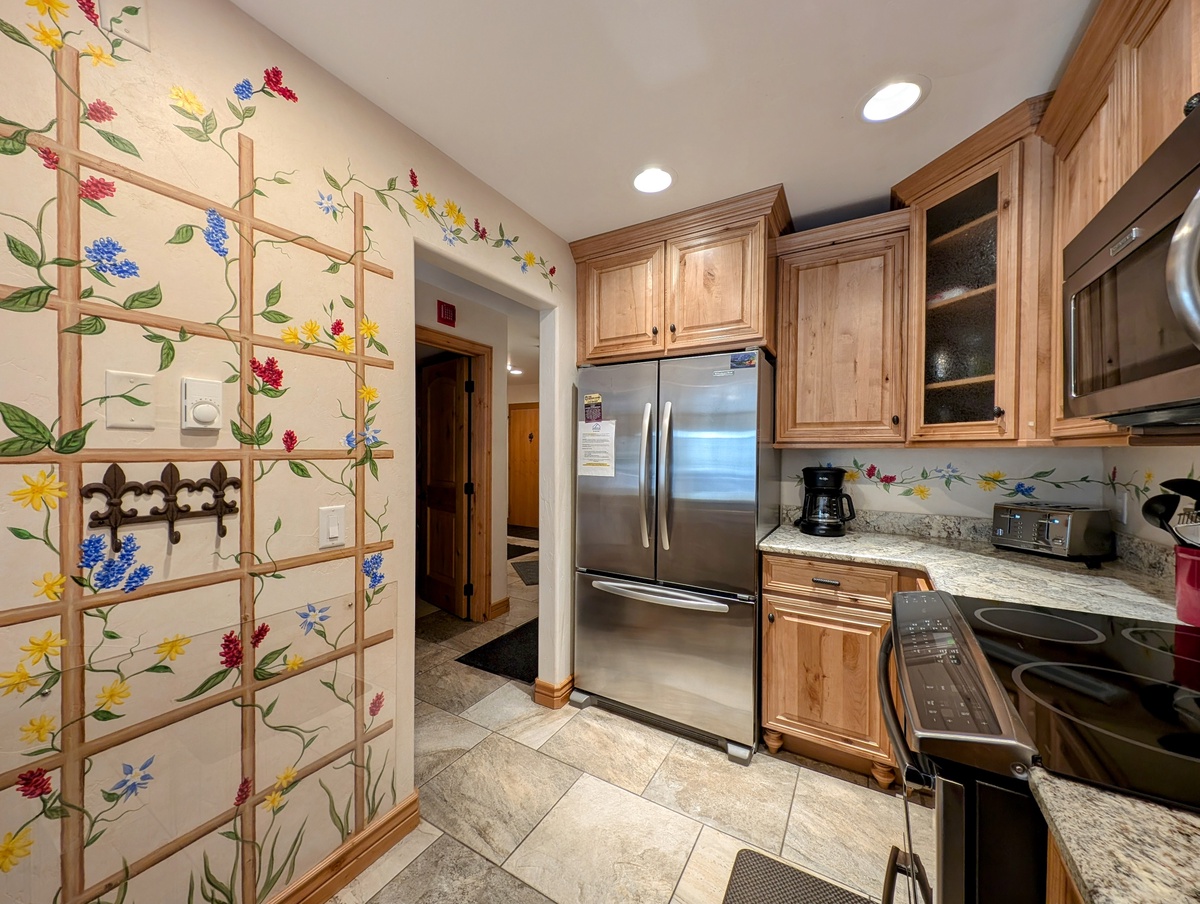 The condo was very nice and a 9 minute walk to the slopes in ski boots. There were a few maintenance issues, but the property managers attended to them right away. We did not use the kitchen that much, but it did seem very well stocked. The condo also provided adequate trash bags, towels, and TP for the stay. The very best part about this condo was the garage and the washer/dryer! Will rent again if possible.