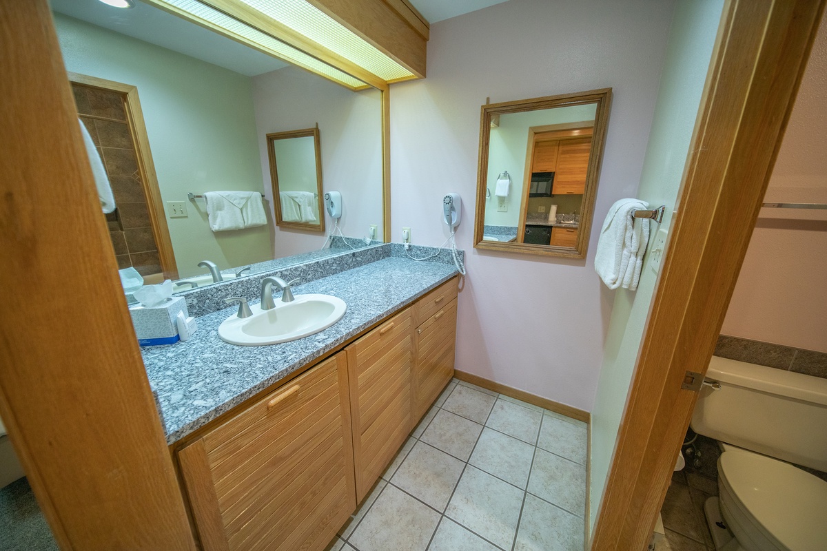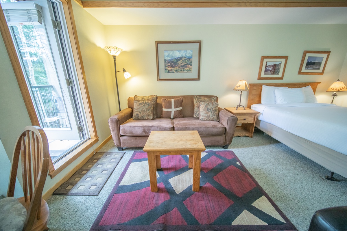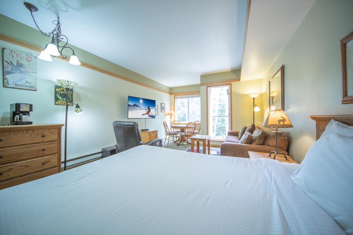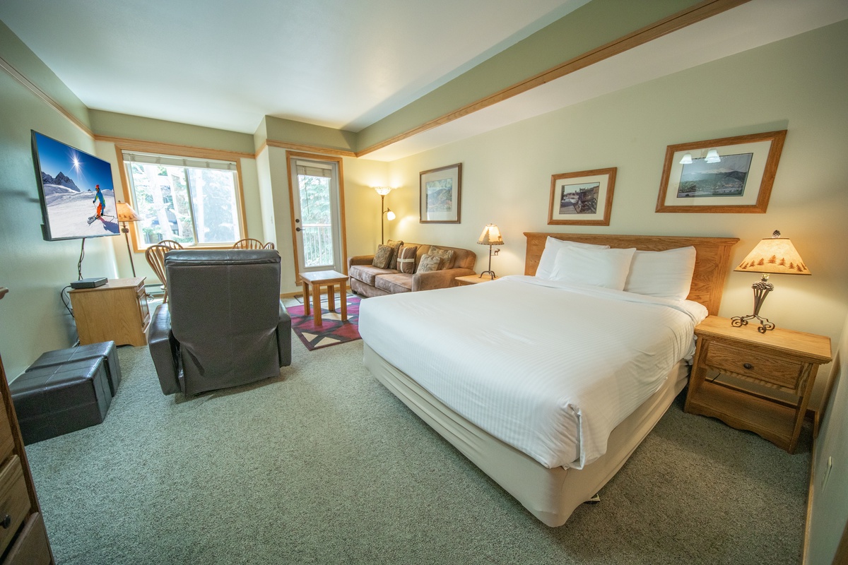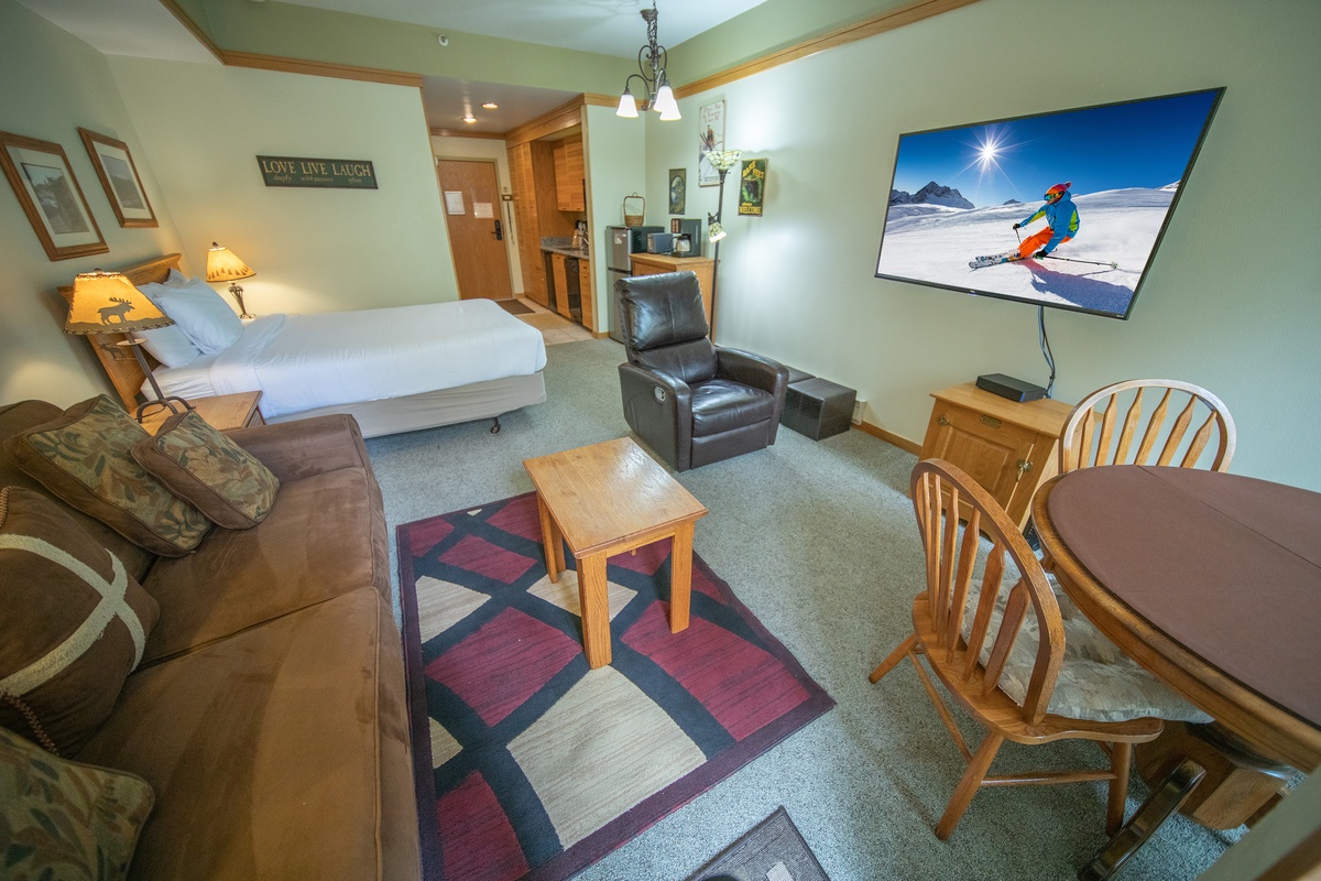 As soon as you step inside, you'll feel right at home in the cozy living area. Relax on the plush sofa while enjoying a movie night on the flat-screen TV. The fully-equipped kitchenette is perfect for preparing easy quick meals. Enjoy your meals at the dining table, surrounded by natural light and breathtaking views of the surrounding mountains.
