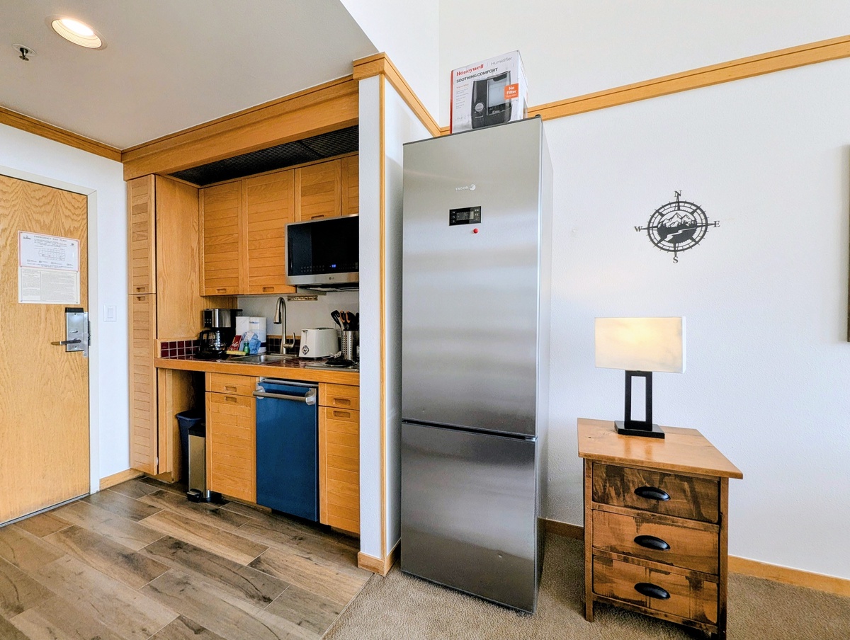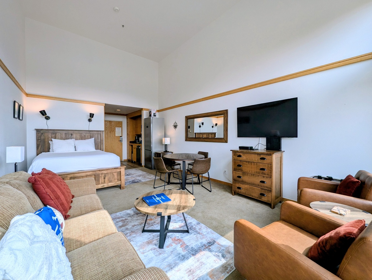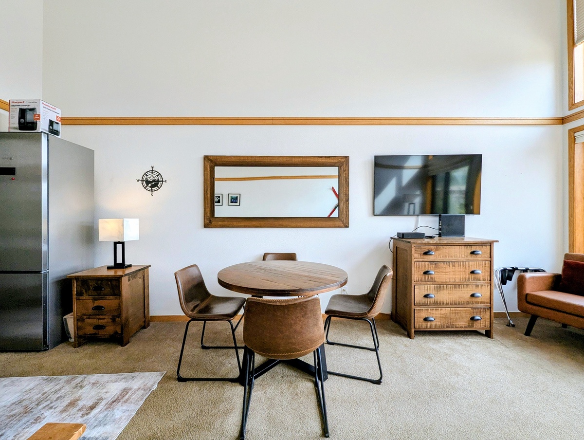 The kitchenette is well-equipped with modern appliances and everything you’ll need to prepare meals, whether it’s a quick breakfast before hitting the lifts or a cozy dinner in after a long day of skiing. A dining area offers the perfect spot to gather, enjoy a meal, and take in the atmosphere of your mountain getaway.