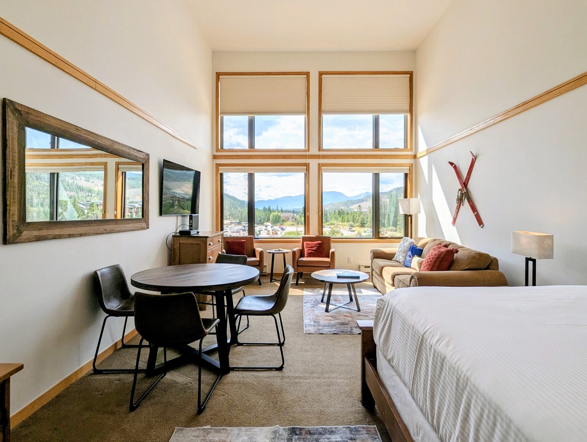 Inside, the condo is warm and welcoming, with a thoughtfully designed open layout that maximizes both comfort and function. A spacious living area, perfect for relaxing after a day outdoors. Large windows fill the space with natural light, while the mountain-inspired furnishings and finishes create a peaceful retreat where you can unwind and recharge.