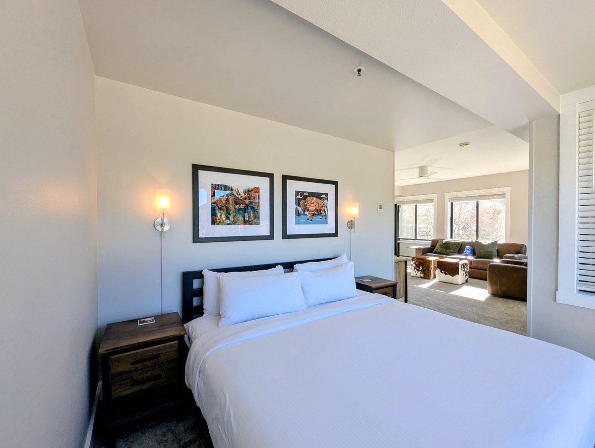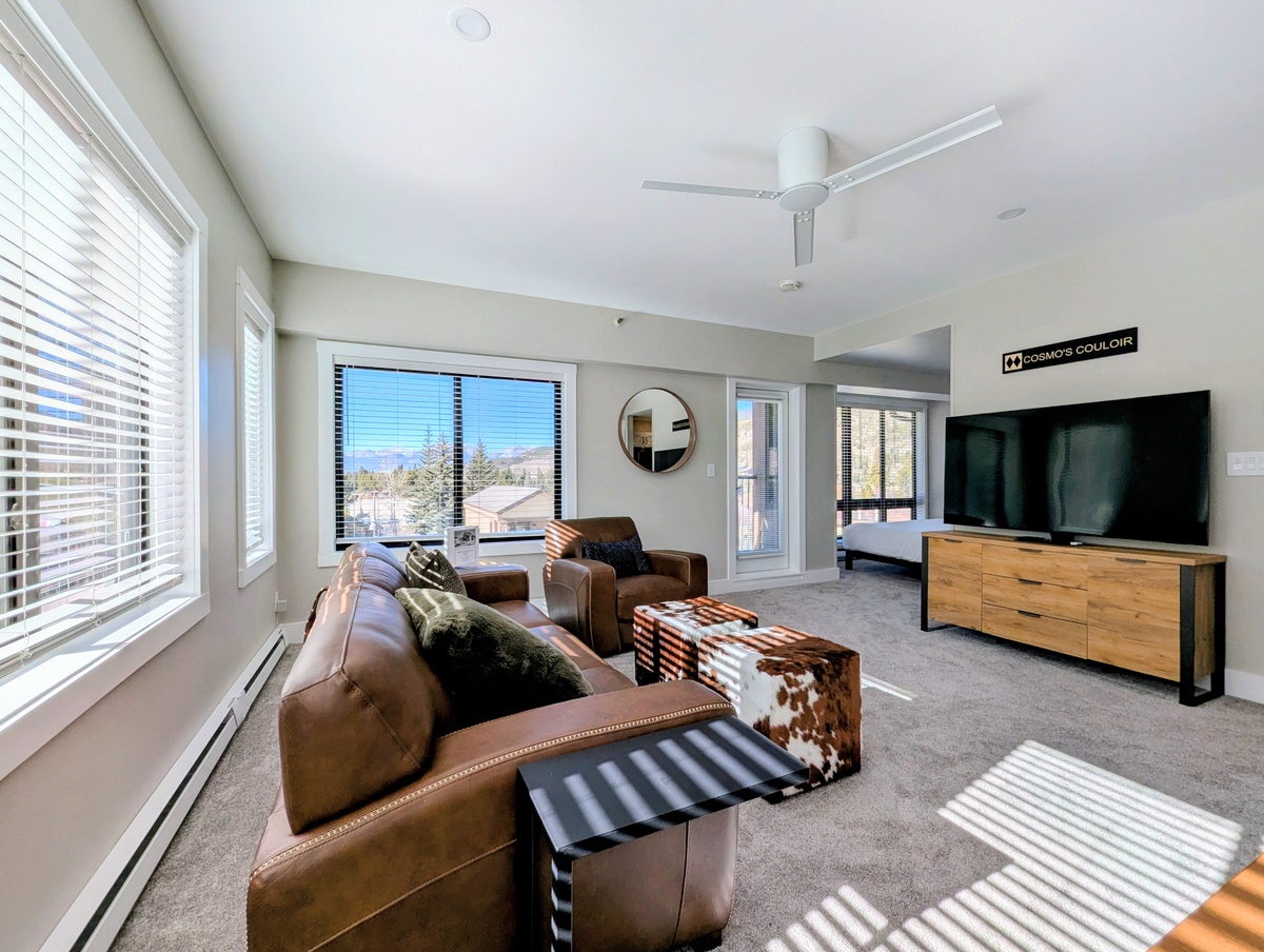 The oversized living area includes built-in cabinets for clothing storage, a dining table for four people, a large flat screen TV, and plush furnishings, making it the perfect place to unwind after a long day of activities. The private balcony offers amazing mountain views -- an ideal spot to enjoy your morning coffee or watch the sunset with a glass of wine.