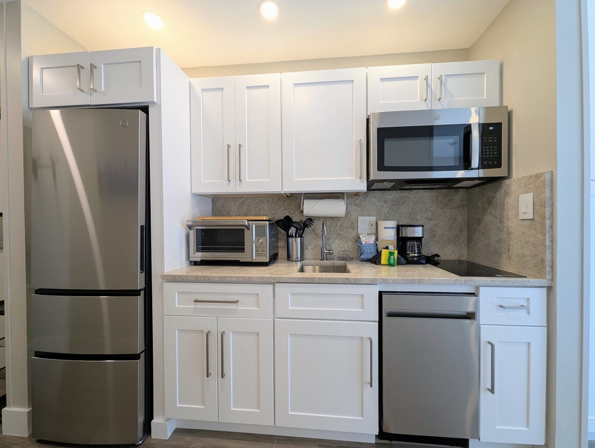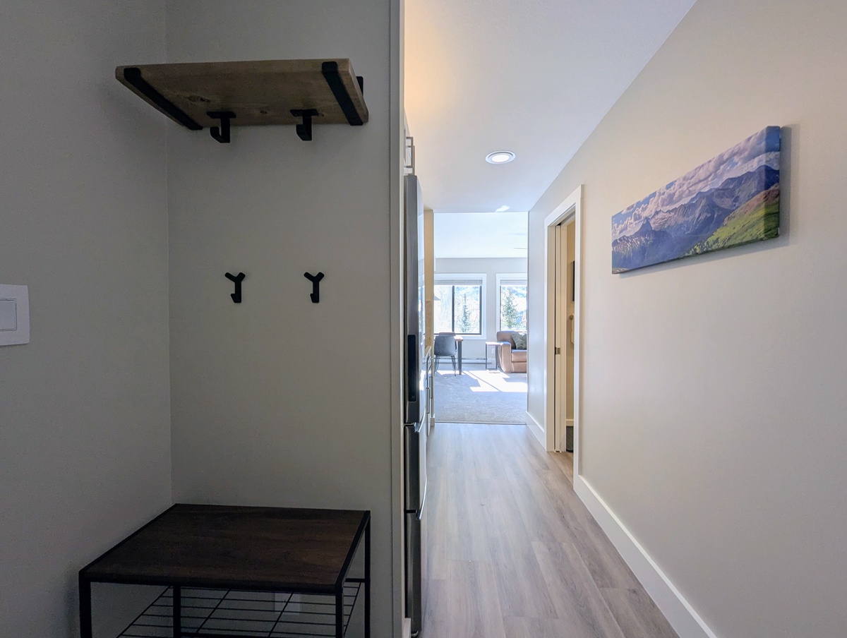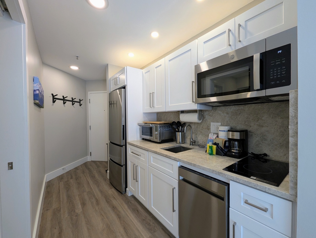 The condo features 1 king size bed and 1 queen size sleeper sofa, easily accommodating 4 people. The entryway features an abundance of hooks to store outdoor gear and a convenient shoe rack. The fully remodeled kitchen includes: granite countertops, a full-size refrigerator, microwave, dishwasher, a two-burner cooktop, drip coffee maker, tea kettle, toaster oven, and toaster, all the essentials for preparing a home-cooked meal during your stay.