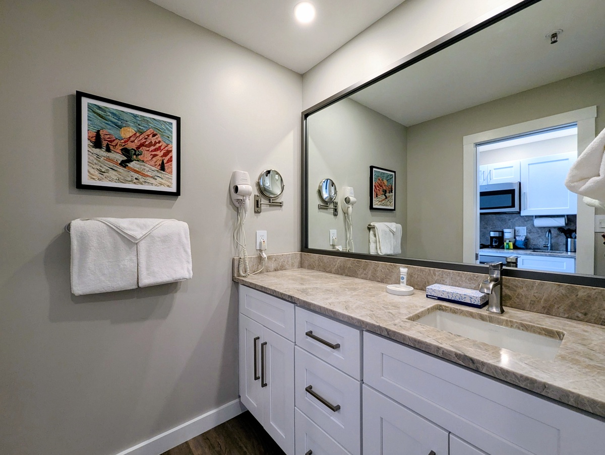 The spacious bathroom includes modern fixtures, granite countertops, and a walk-in shower enclosure. Guests will also appreciate the building’s on-site amenities, such as two hot tubs, ground level dedicated ski storage, a convenient heated garage, and a shared washer and dryer located down the hall from the unit.