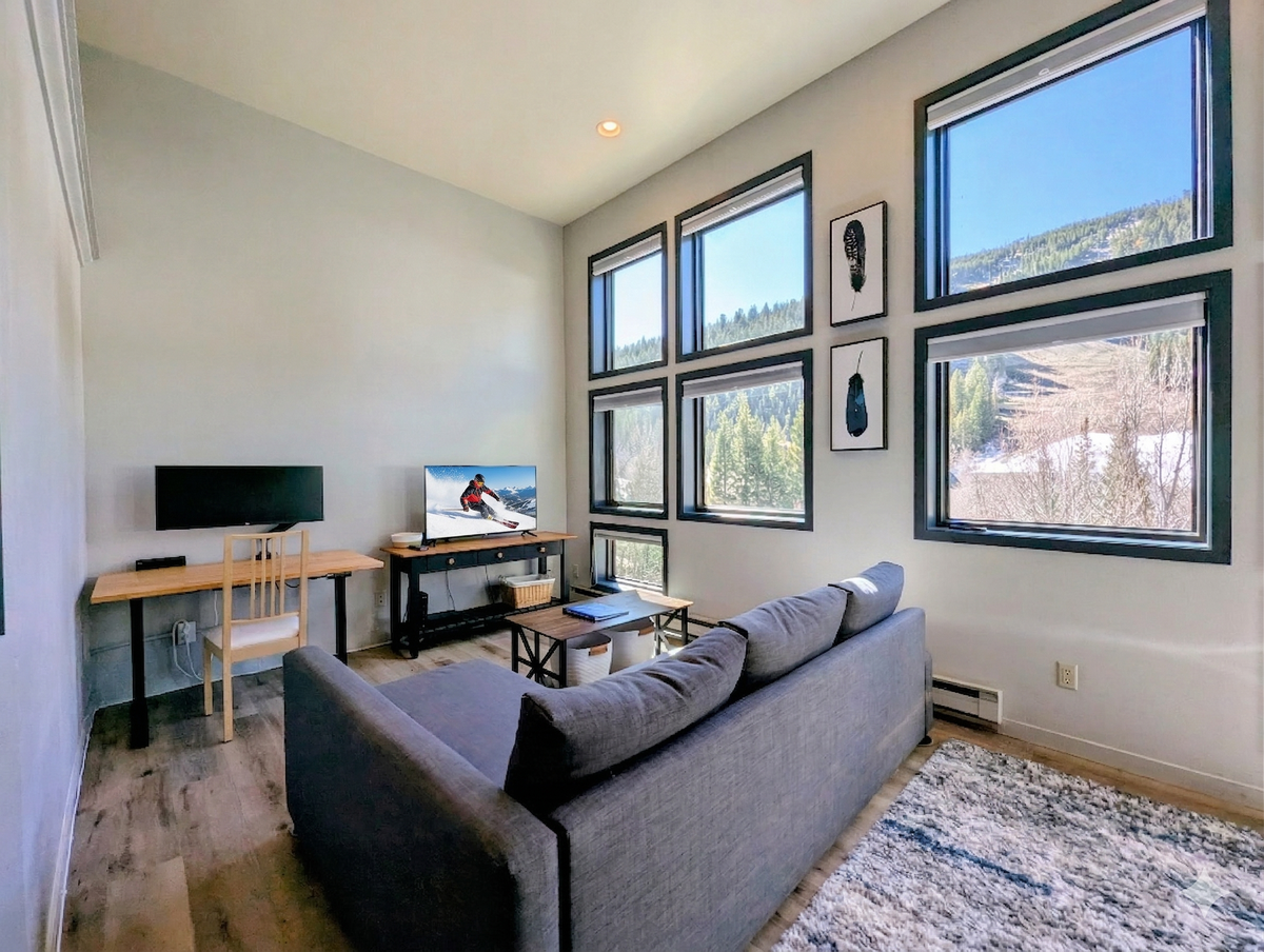 Step inside a bright, modern escape where comfort meets contemporary mountain chic. The open-concept living area is instantly inviting, highlighted by a striking wall of expansive windows that frame a spectacular, close-up view of the surrounding slopes and mountains. Natural light floods the space, accentuating the warm wood tones and plush, gray furnishings. The living room provides a perfect spot to unwind, whether you’re cozying up by the entertainment center or simply soaking in the mesmerizing alpine scenery that serves as your personal backdrop.