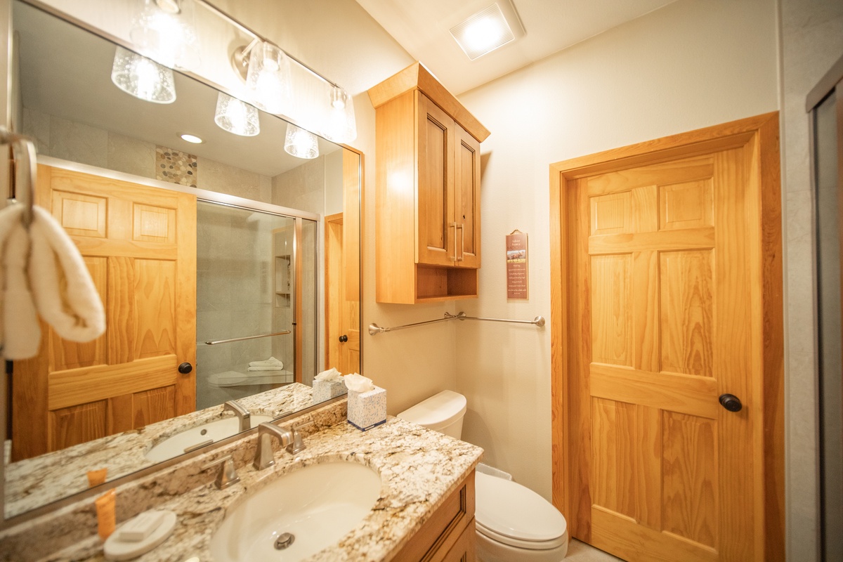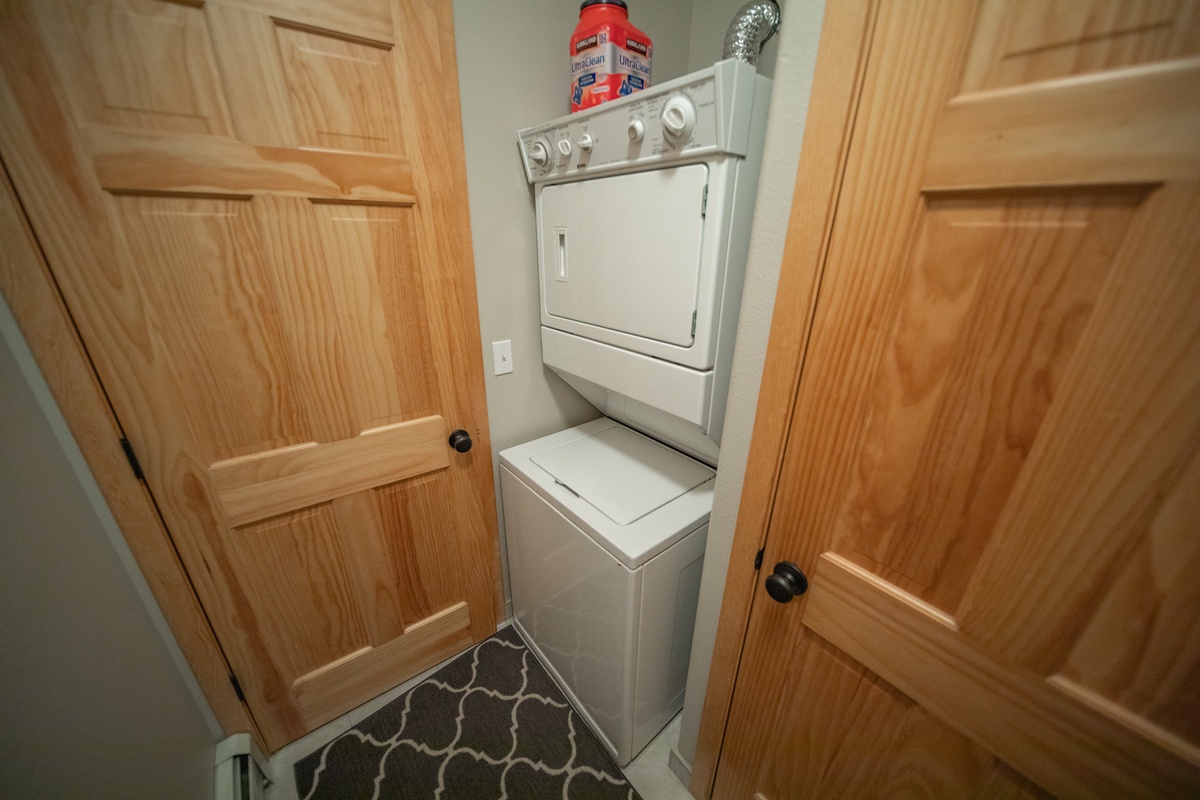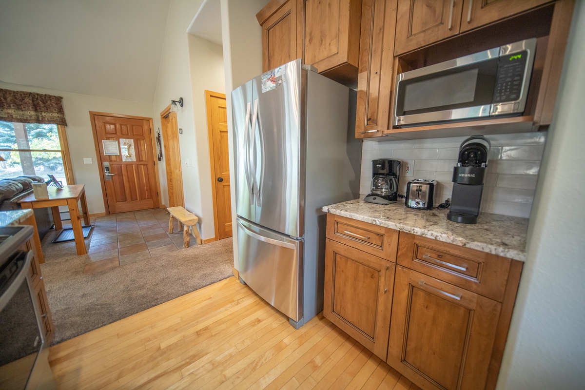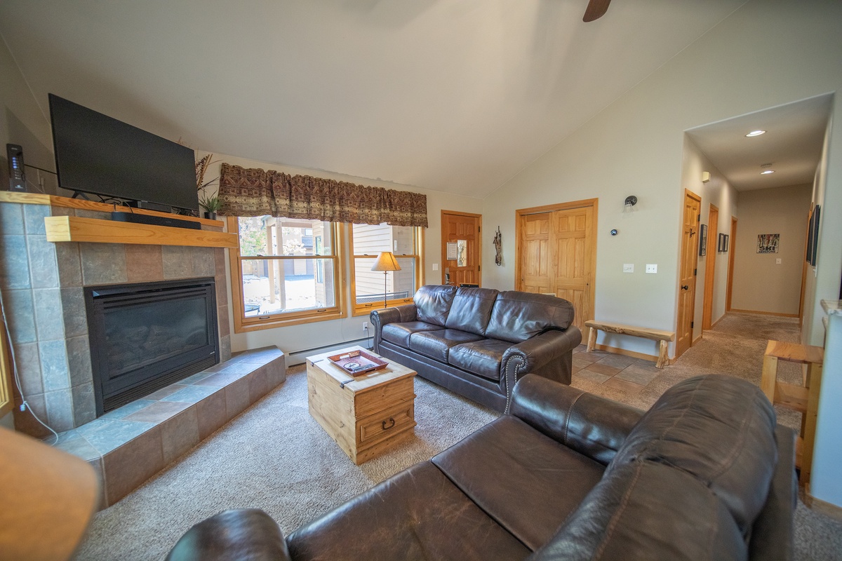 Step into the townhome and you’ll be greeted by a cozy living room with plush furniture and serene decor. The room is built for relaxation, with inviting seating surrounding the TV, complete with a warm fireplace. The fully-equipped kitchen is easily accessible to start whipping up delicious meals. It has everything you need including an oven, fridge, microwave, dishwasher, and all the cookware and utensils you could need.