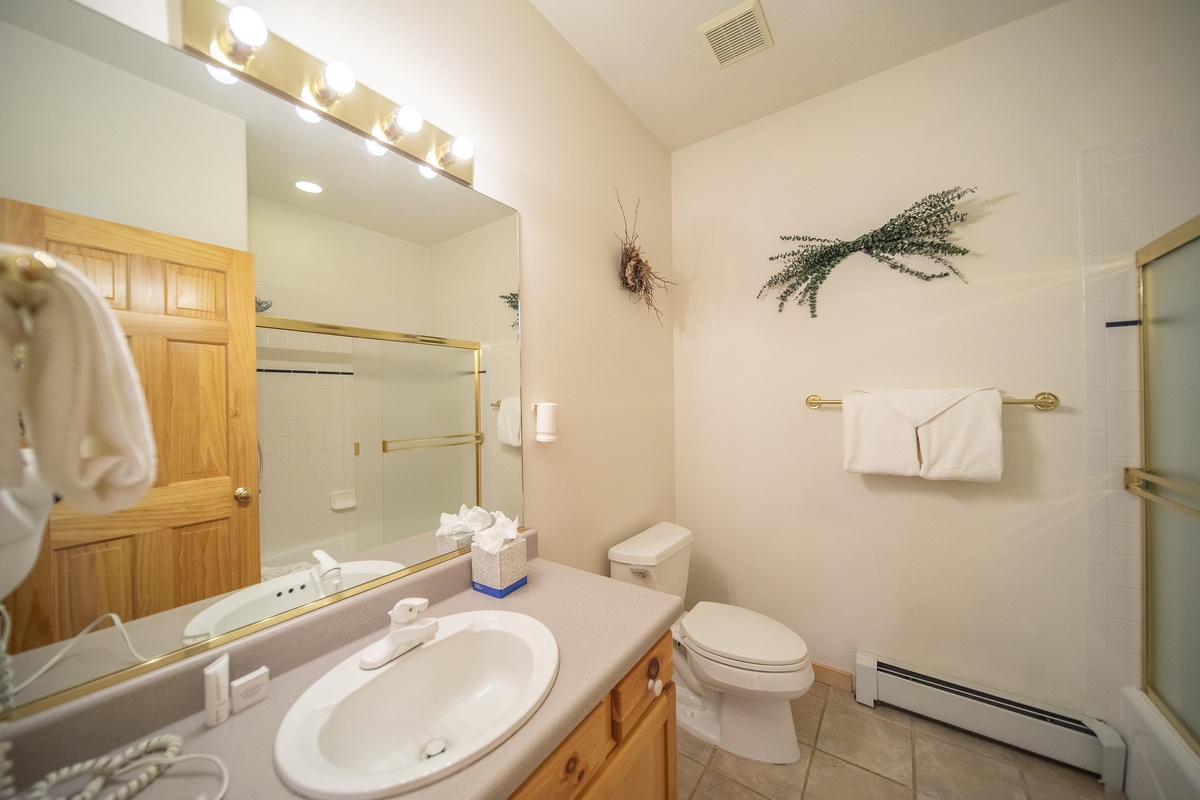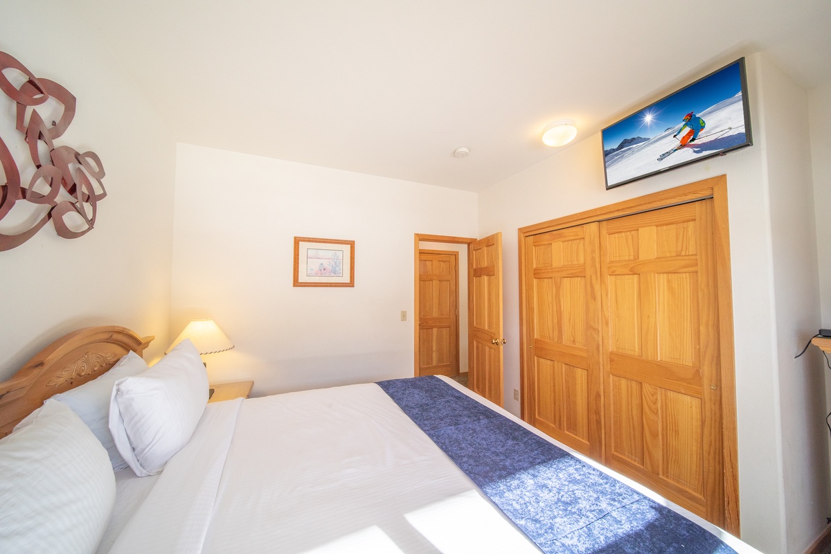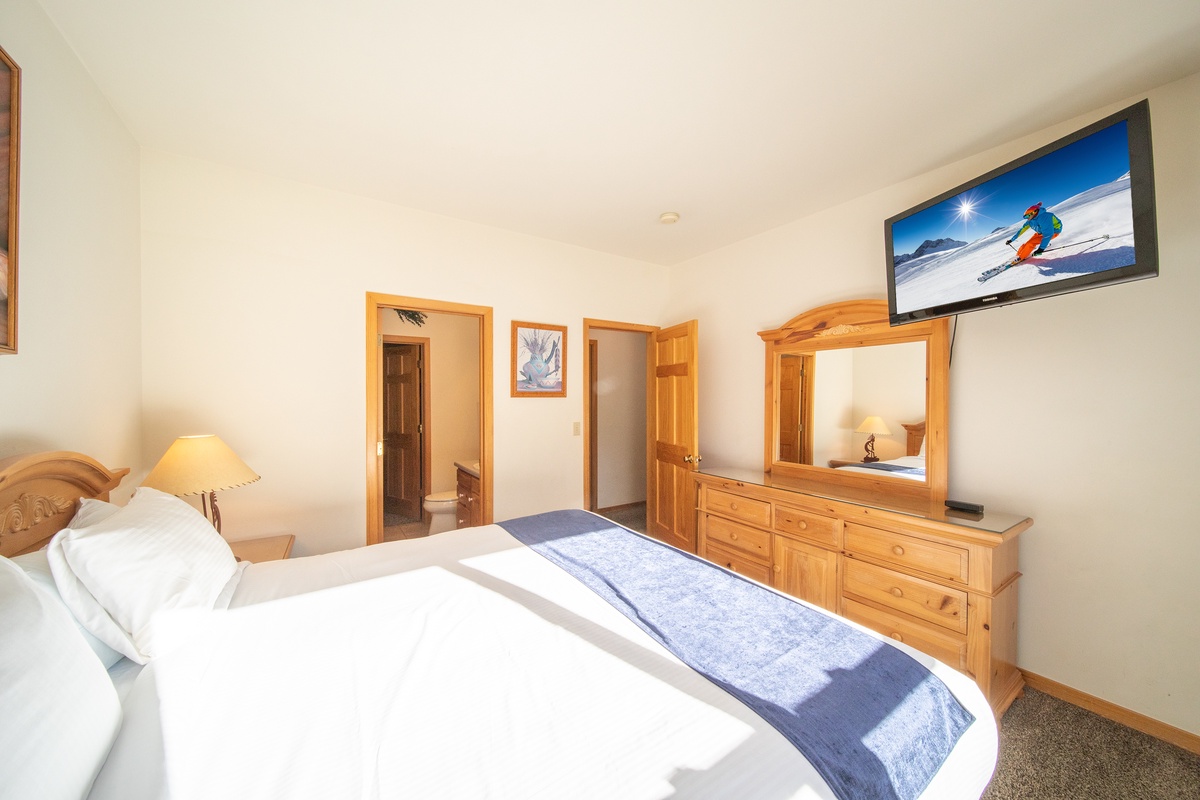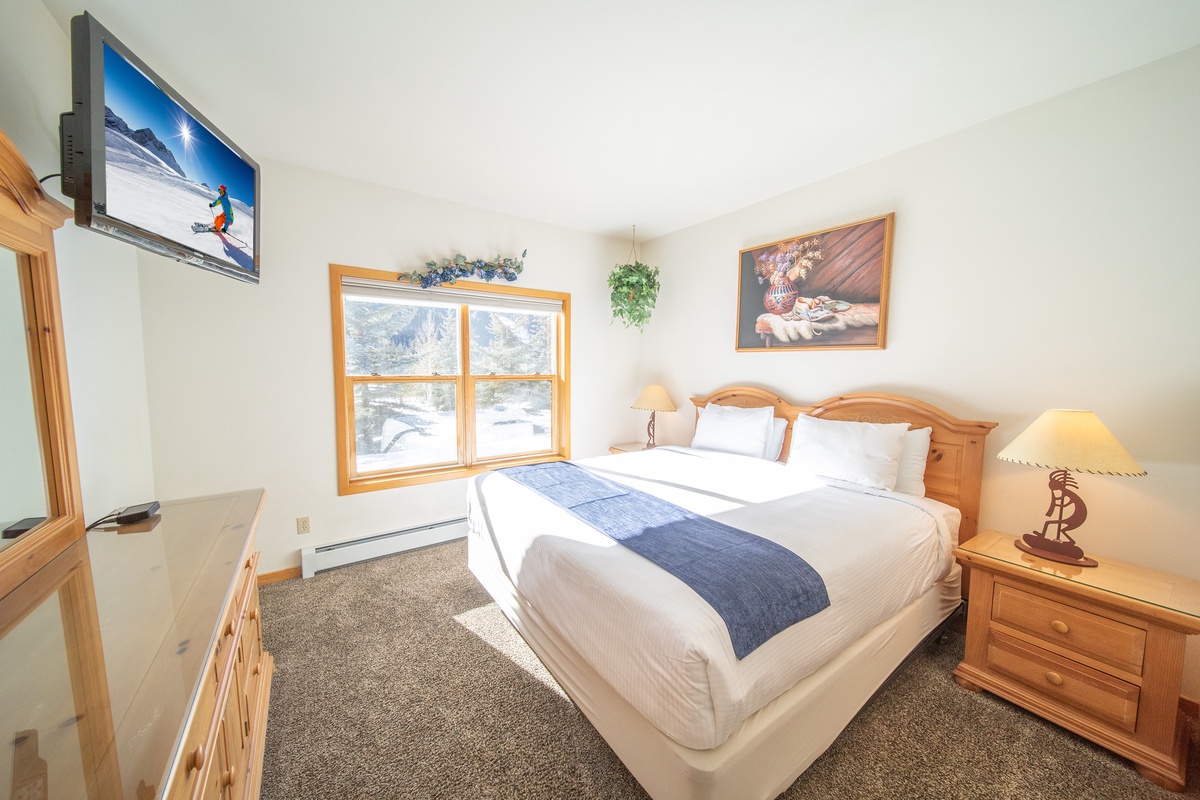 Head down the hall to the master bedroom where you’ll find ultimate comfort in the plush bedding and luxurious linens. The expansive windows allow you to soak in the stunning mountain views from the comfort of your own bed. The ensuite bathroom features a large tub/shower combo making it feel like your own personal retreat. The second bedroom is perfect for kids or additional guests, with ample sleeping arrangements and an adjacent bathroom.
