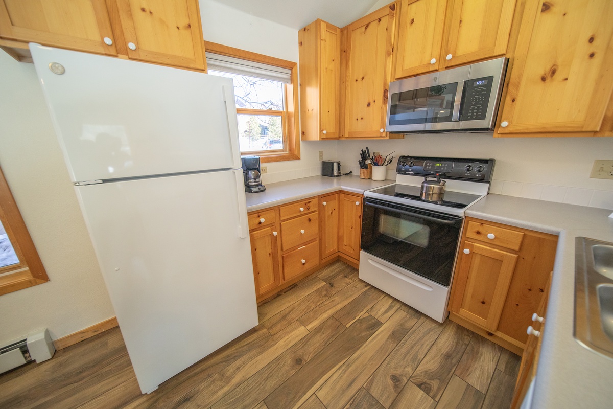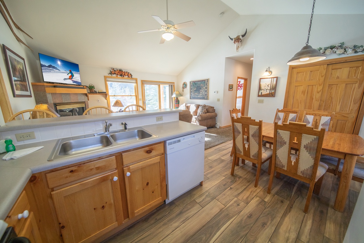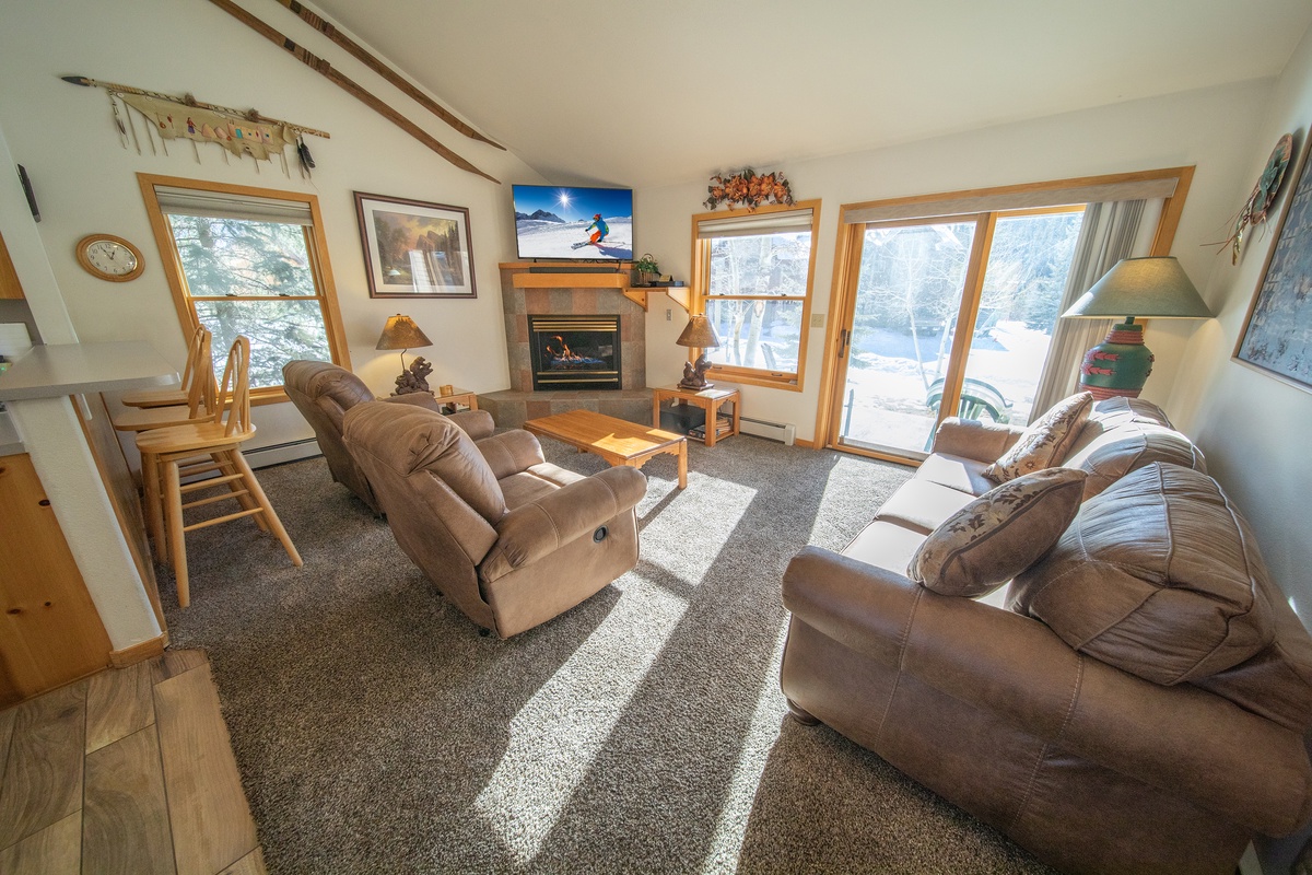Enter the townhome and immediately be greeted by the spacious and beautifully decorated living area. The large windows provide breathtaking views of the Rockies along with ample natural light. The plush furniture and cozy fireplace make this space the perfect spot for relaxing after a day on the slopes. The fully equipped kitchen is ideal for preparing delicious dinners and lunches for the slopes.