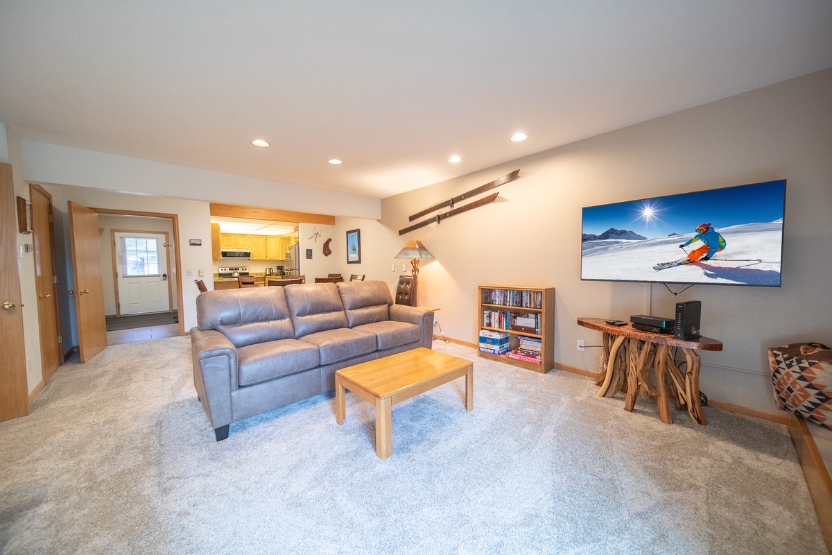 The inviting living room provides a cozy setting to relax after a day of adventure. Featuring new sofas purchased in 2024, a welcoming gas fireplace, and a Smart TV for movie nights, it's the perfect spot to unwind. Step onto the upper-level balcony to take in the fresh mountain air.