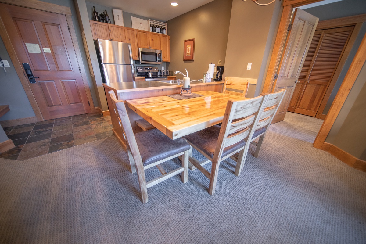 Meal preparation is a delight in the condo's modern and fully equipped kitchen. A large countertop and stainless steel appliances make it easy to prepare hearty meals for your family or friends. Adjacent to the kitchen is a comfortable dining area, perfect for enjoying leisurely meals or planning the day's adventures over a morning cup of coffee.