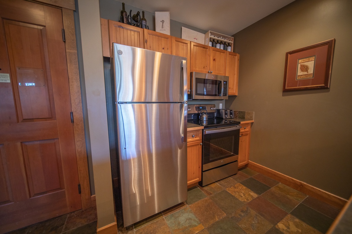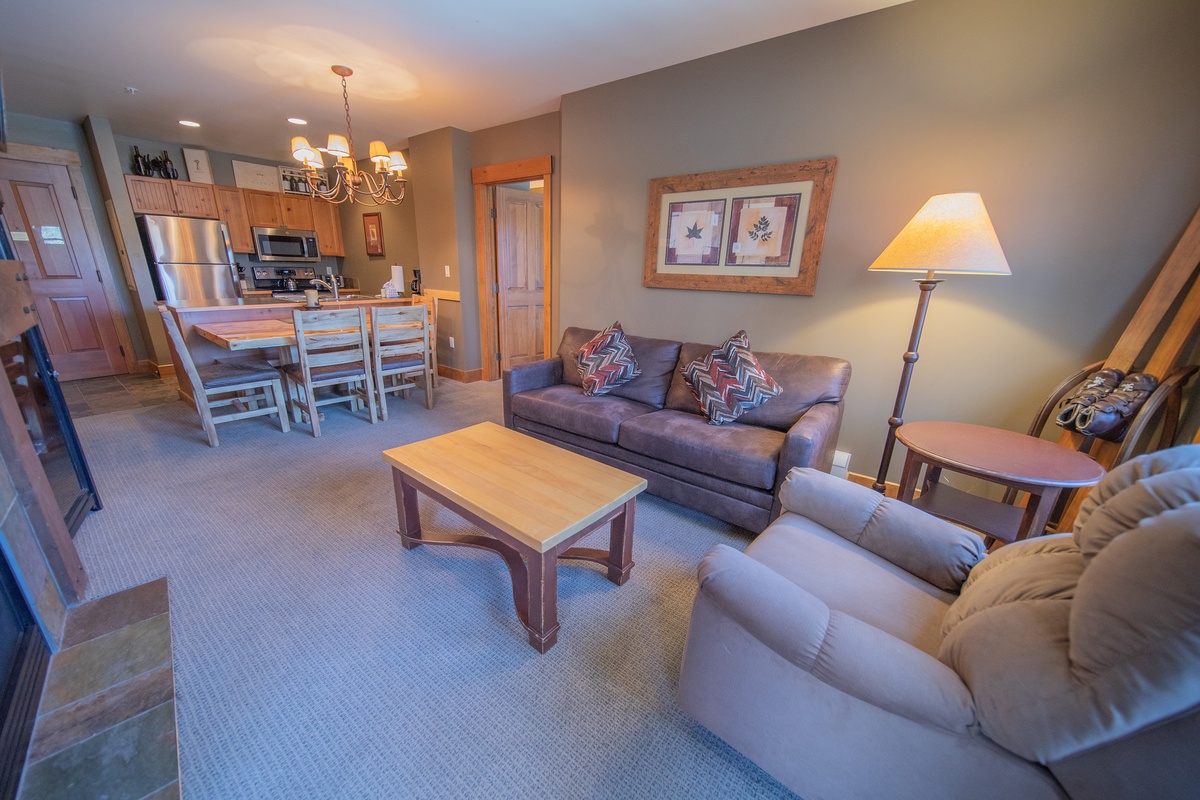 Step inside the condo to be greeted by a harmonious blend of mountain charm and modern elegance. The living room invites relaxation with its plush seating, cozy fireplace, and large windows that frame picturesque views of the snowy mountains and vibrant village. Warm wood tones and tasteful décor create a truly welcoming ambiance for those nights you wish to stay in and enjoy the company of loved ones.