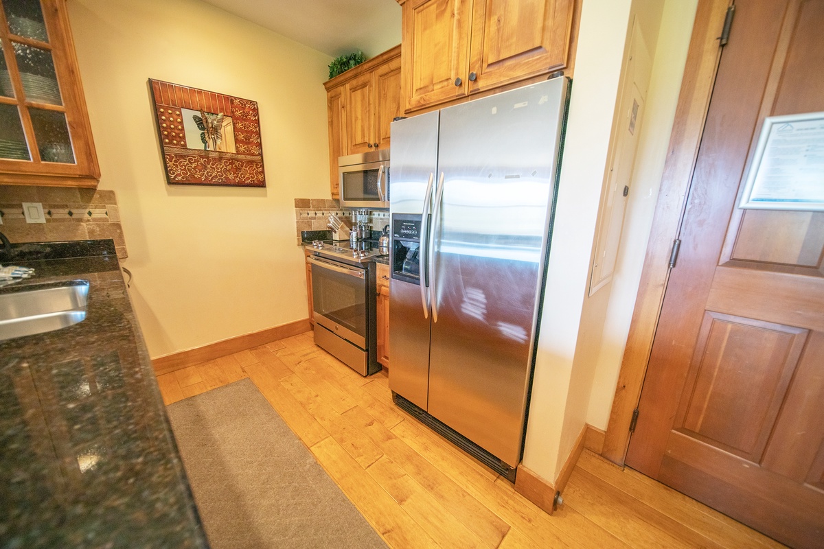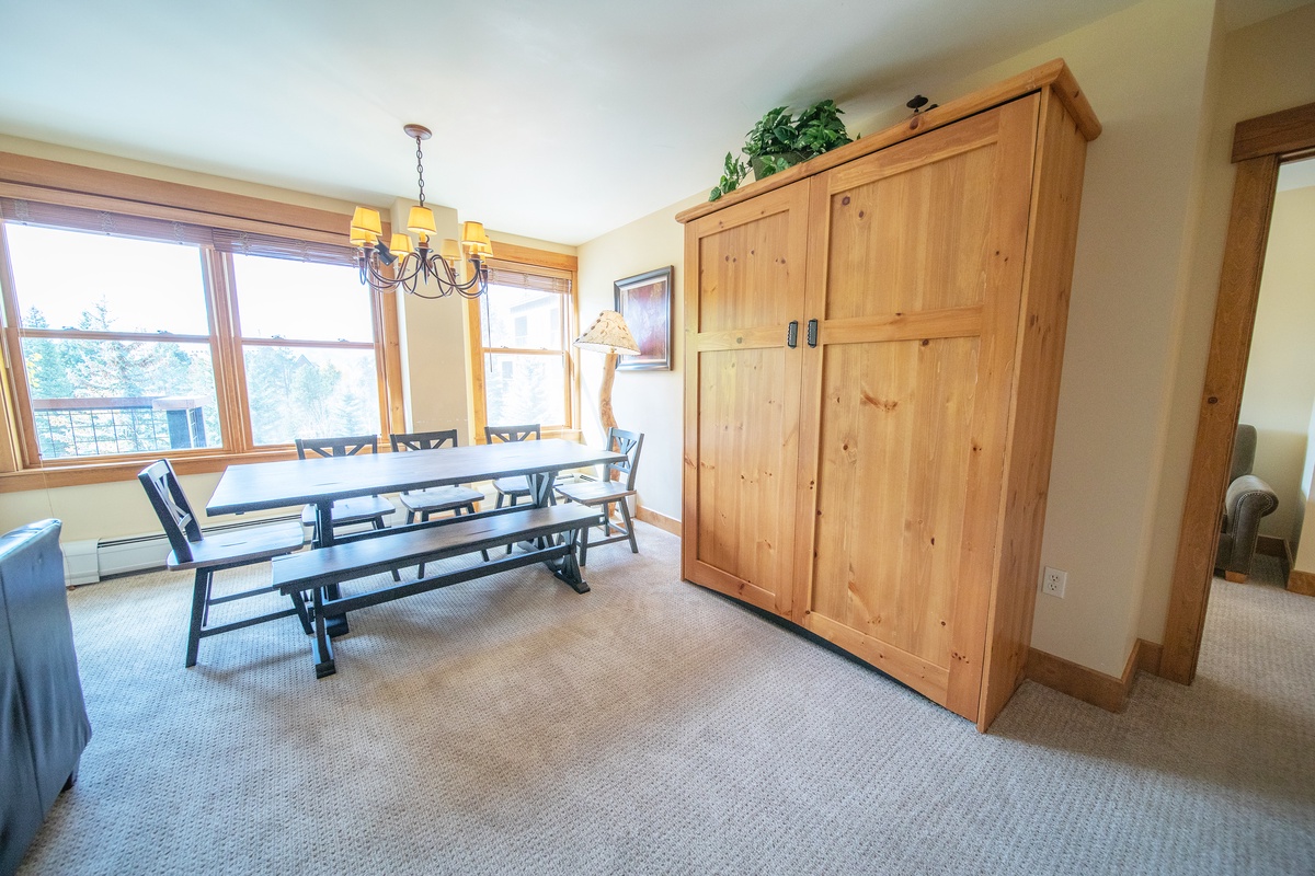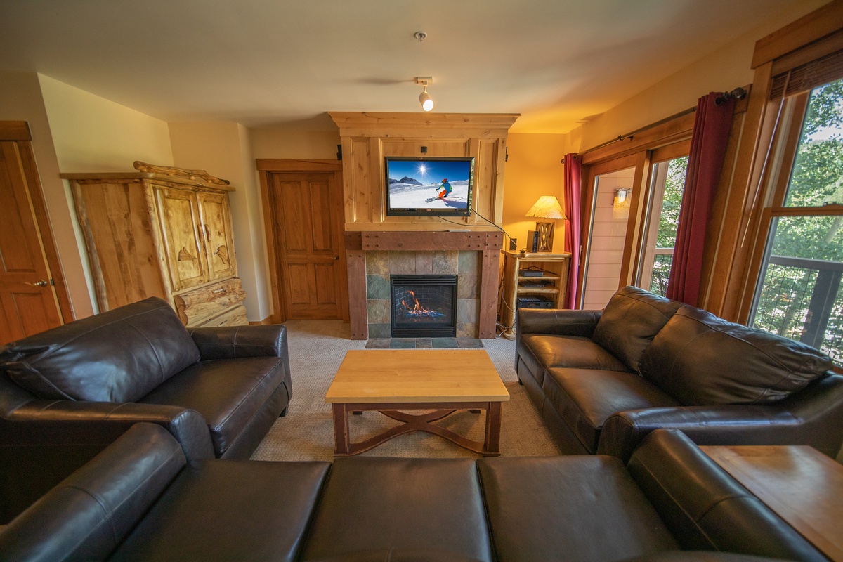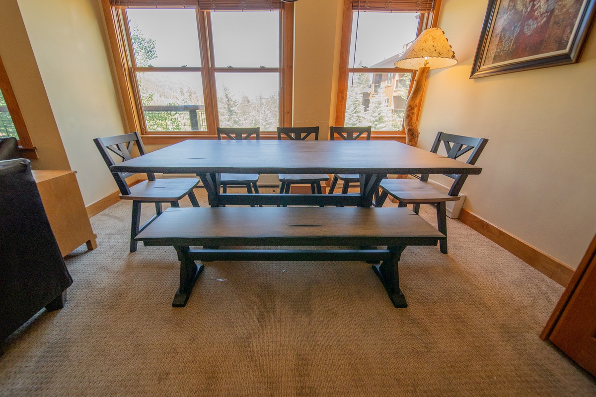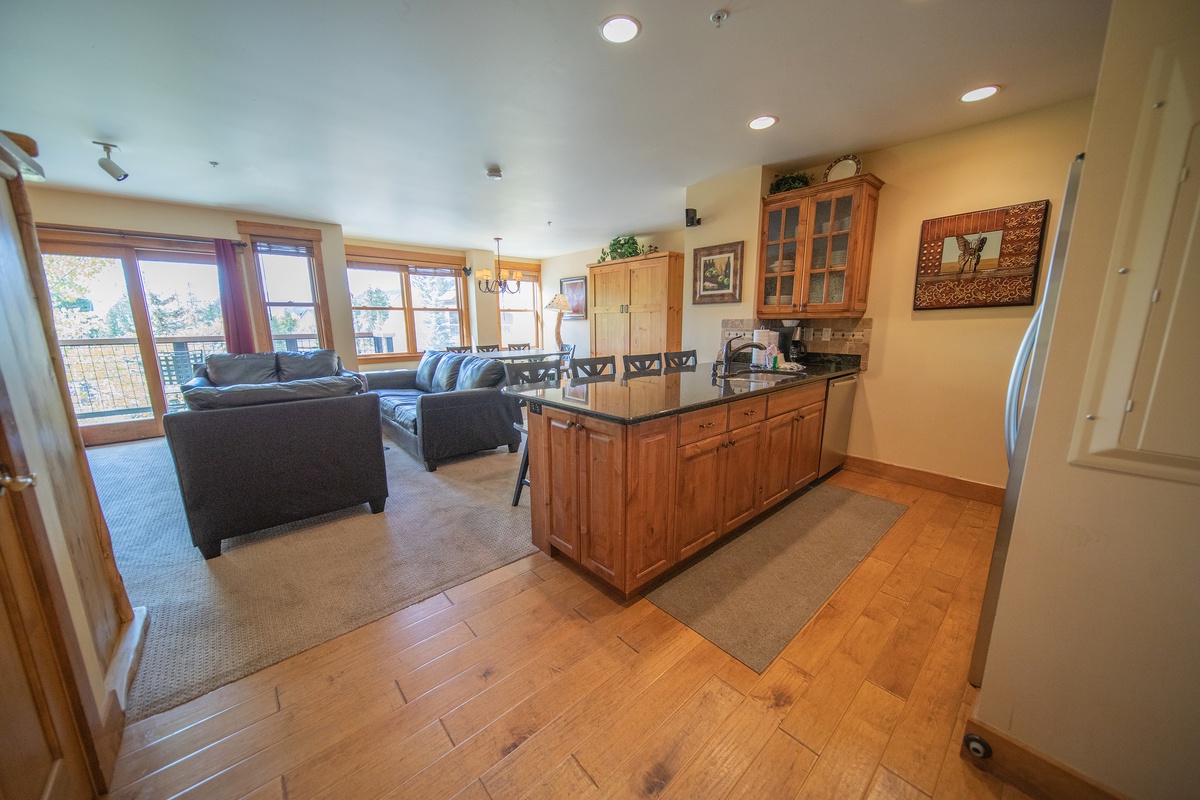 Upon entering the condo, you are greeted by a warm, open-concept living area that invites relaxation. Here, a plush, cozy seating area centers around a grand fireplace, making it an ideal spot to unwind after a day on the slopes. A large, flat-screen TV promises entertainment on demand. The adjoining gourmet kitchen, with its sleek countertops and state-of-the-art appliances, beckons you to prepare hearty meals with ease. Adjacent to the kitchen, the dining area offers an elegant space for enjoying home-cooked meals or entertaining guests.