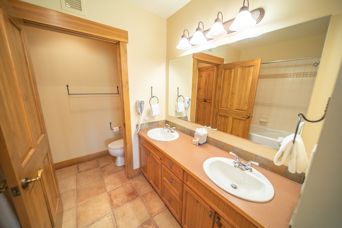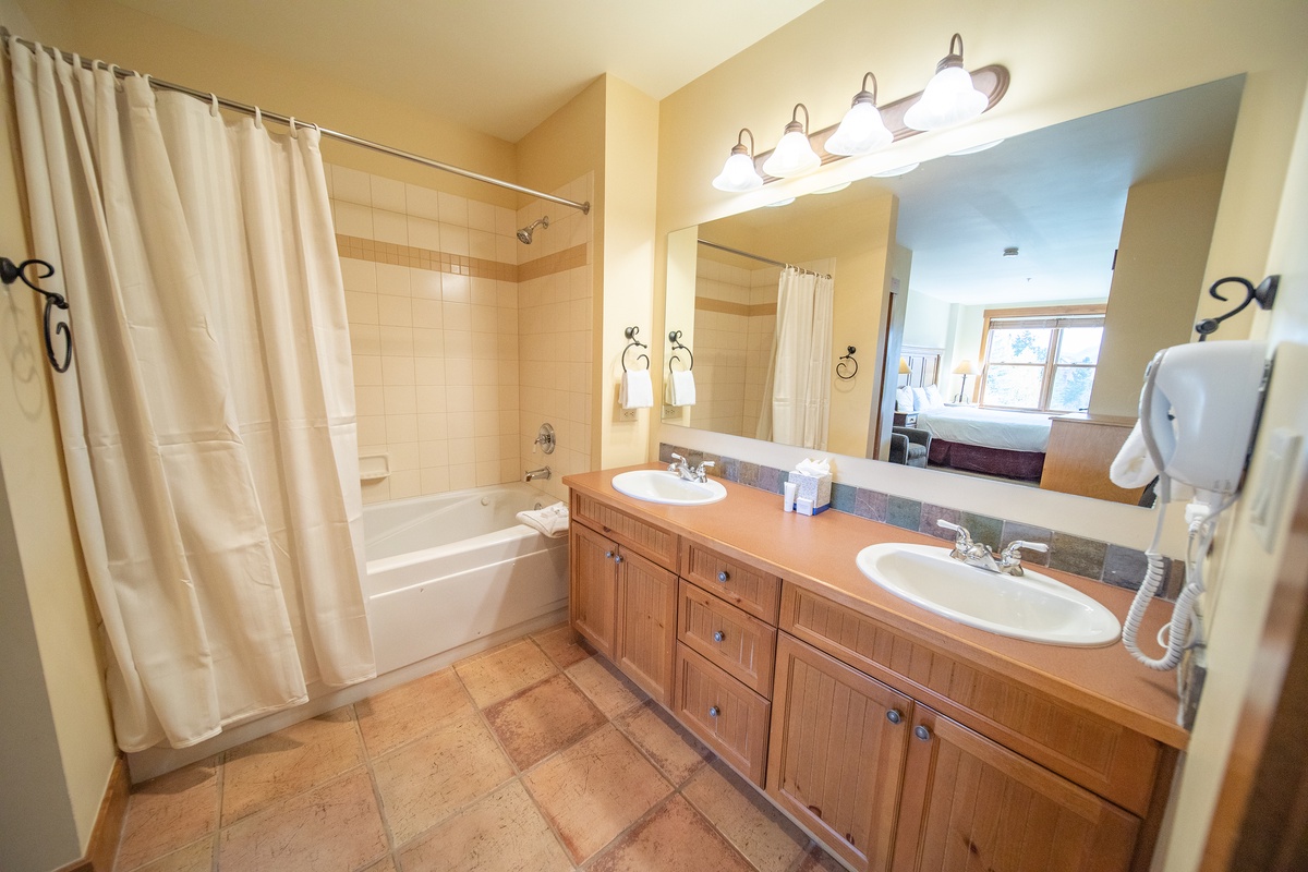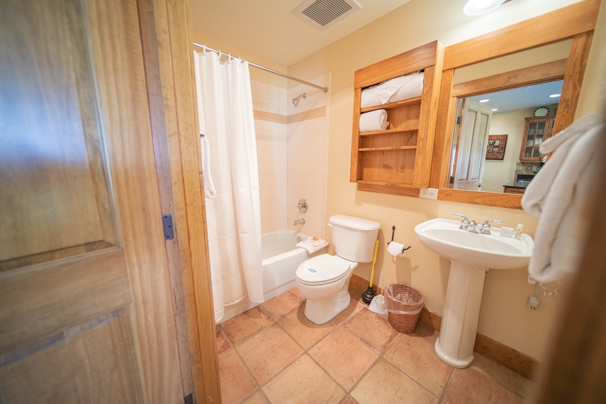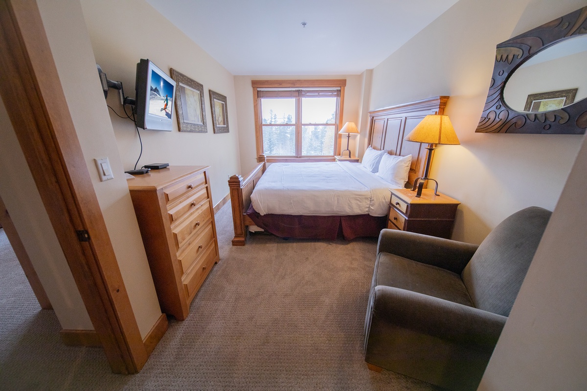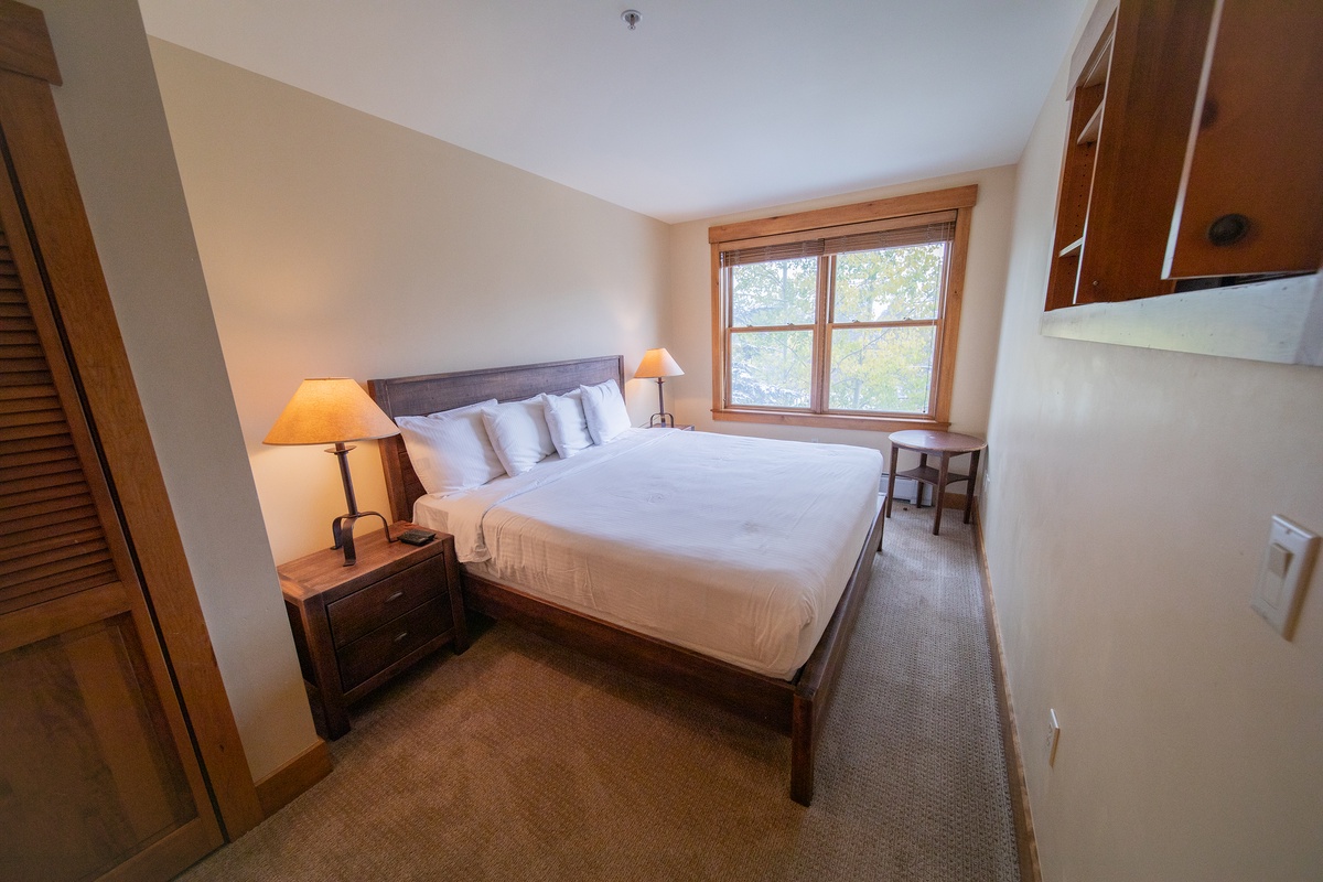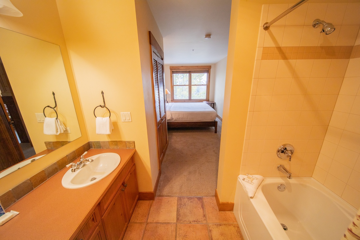Further into the condo, the two spacious bedrooms serve as serene retreats. Each room is expertly furnished, boasting ample storage space and beautifully crafted private bathrooms that exude tranquility. Here, luxury meets comfort in a symphony of warm hues, soft linens, and subtle touches of mountain decor.