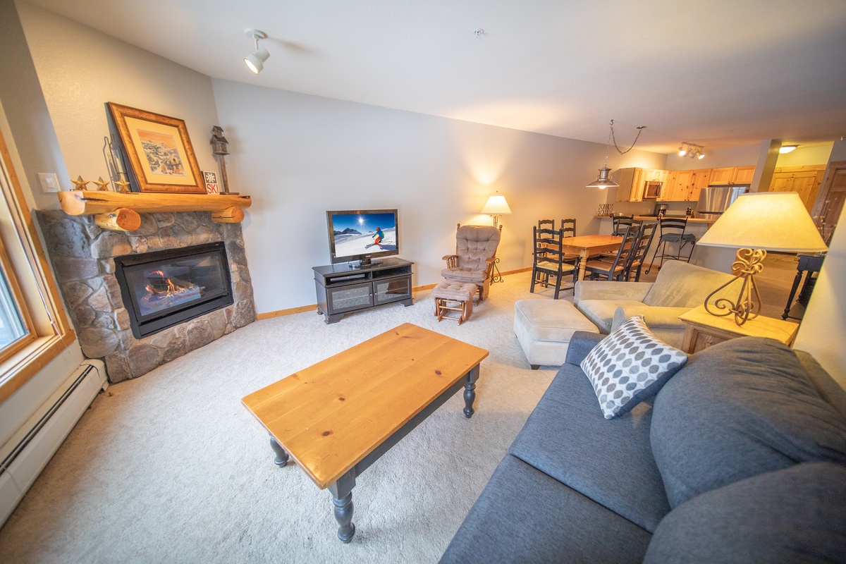 Enter into a cozy condo that harmoniously blends mountain charm with contemporary comforts. The open-concept living space is adorned with tasteful furnishings, a fireplace, and expansive windows that frame breathtaking mountain vistas.