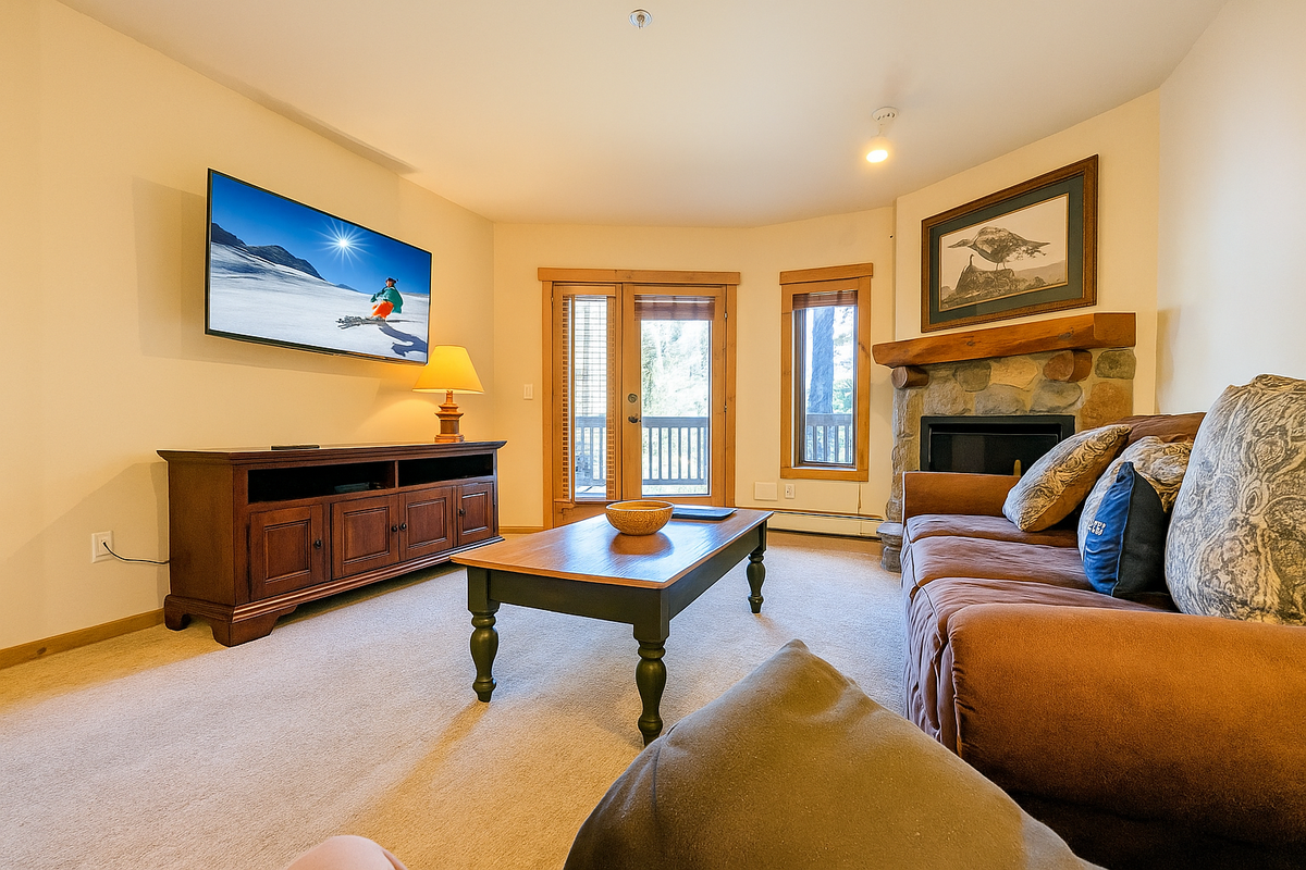 The moment you step inside, you'll feel right at home in this warm and inviting space. Cozy up on the plush sofa in the living room, surrounded by rich wooden accents and a crackling fireplace. The fully equipped kitchen features modern appliances and plenty of counter space to whip up a gourmet meal, or warm up with a cup of hot cocoa after a day on the slopes. The dining area provides ample seating for your group, with beautiful views of the surrounding mountains.