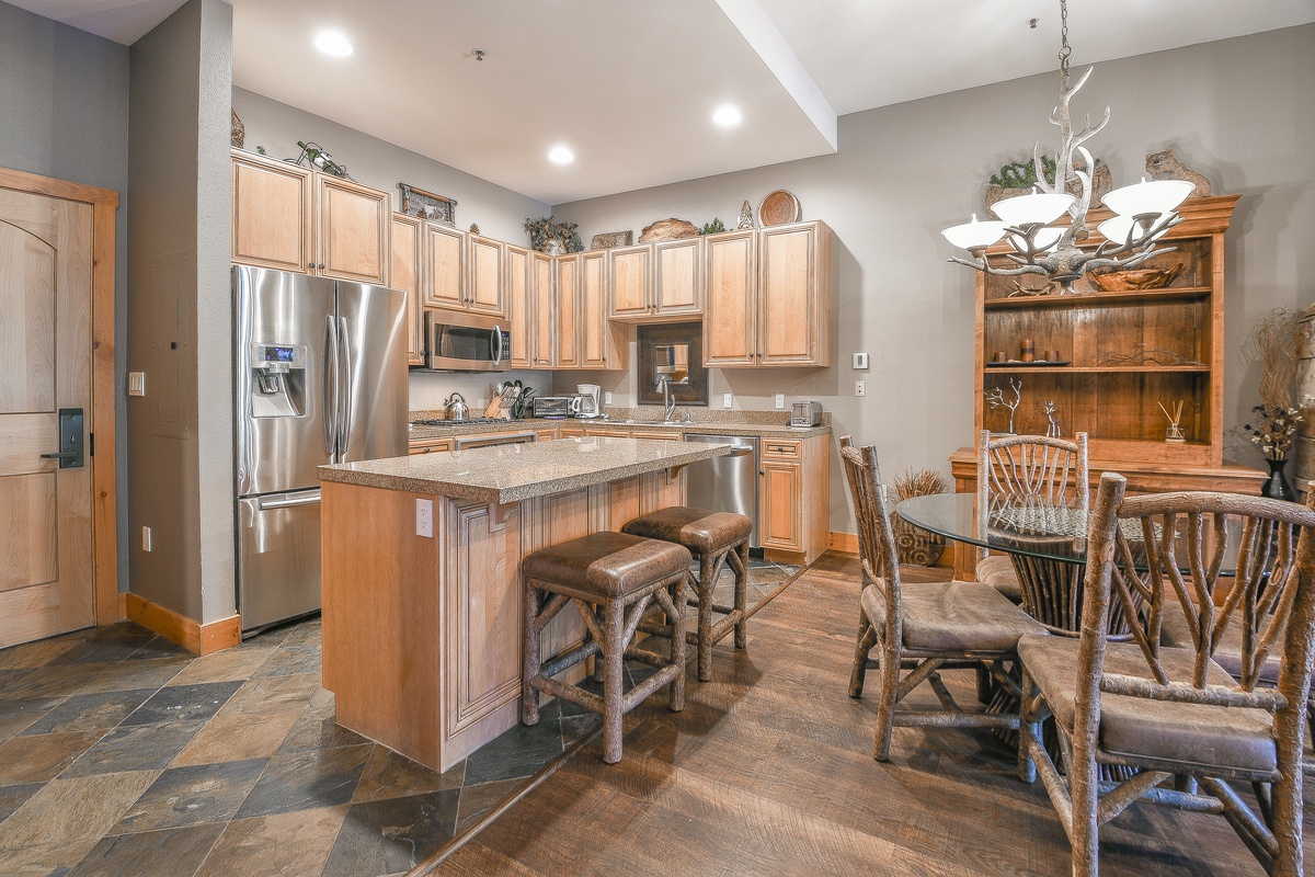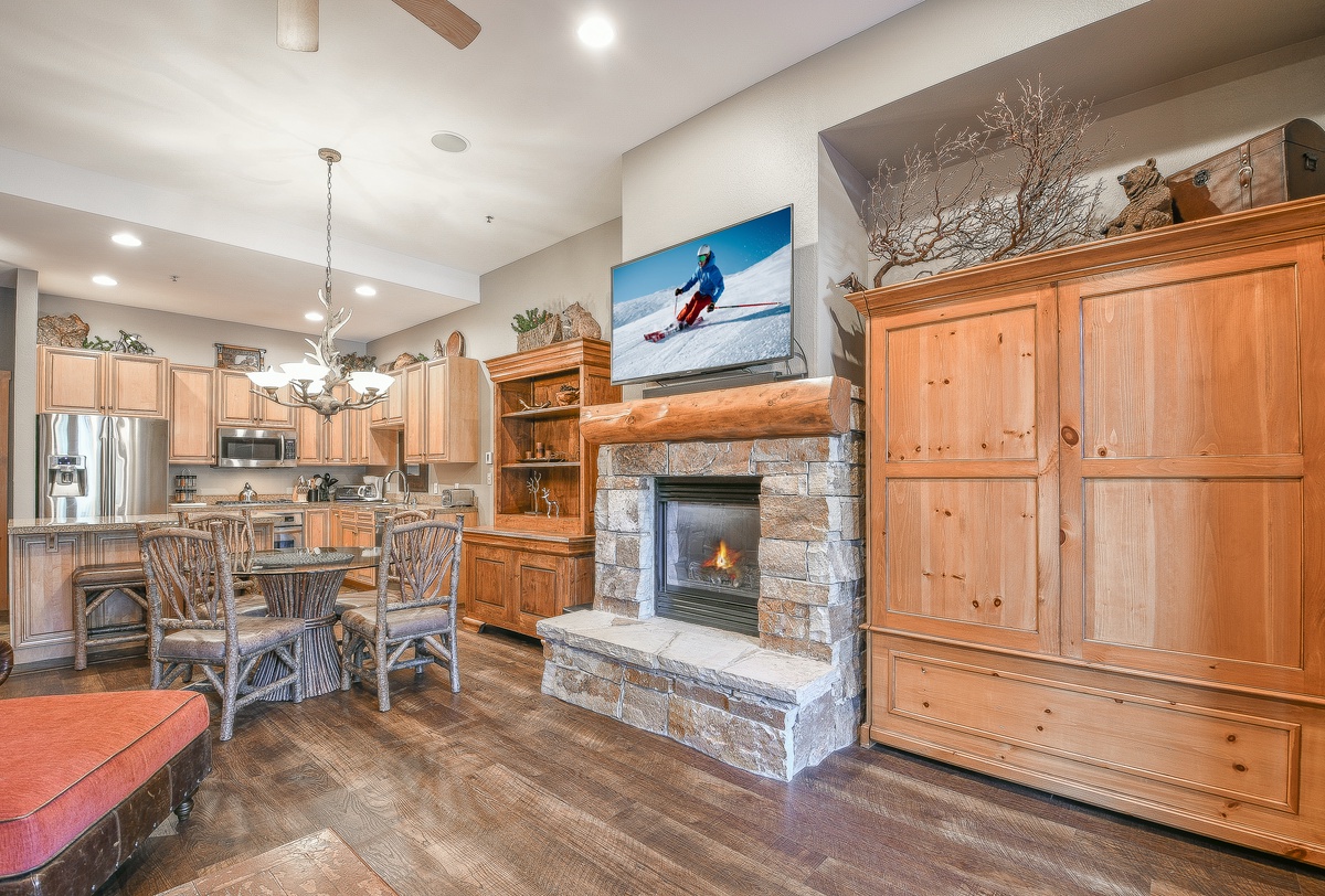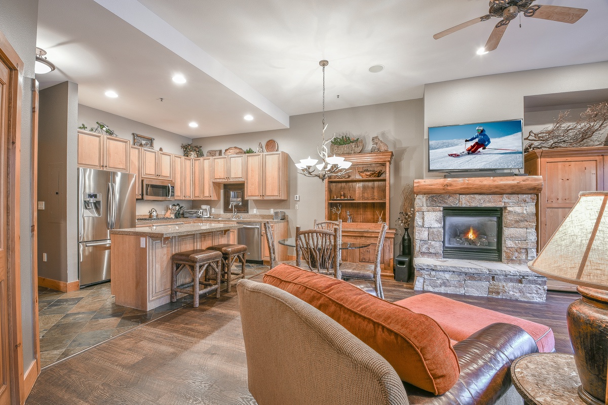 A stay here means savoring the impressive alpine views showcased through floor-to-ceiling windows that flood the interiors with natural light. The living room, complete with plush seating and a gas fireplace, invites guests to unwind after an exhilarating day on the slopes. For the culinary inclined, the kitchen comes fully equipped with stainless steel appliances and sleek granite countertops, providing the perfect stage to craft delightful home-cooked meals.