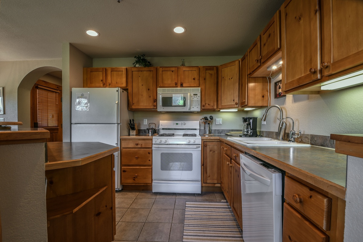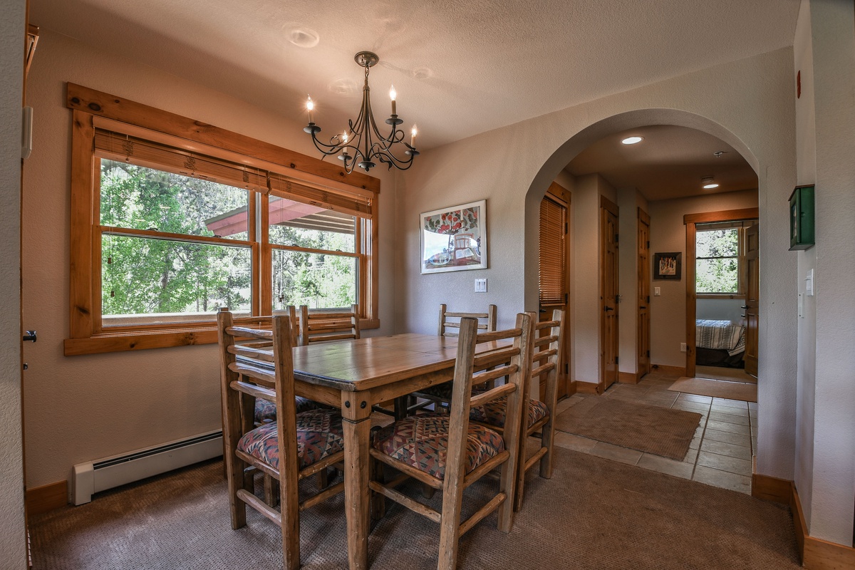 The fully equipped kitchen allows you to whip up all your favorite meals and snacks. There is a breakfast bar with seating for a quick bite to eat before heading out for the day or a cup of cocoa for the kids on a chilly evening. The dining room is set up with a large table to enjoy a great meal together.