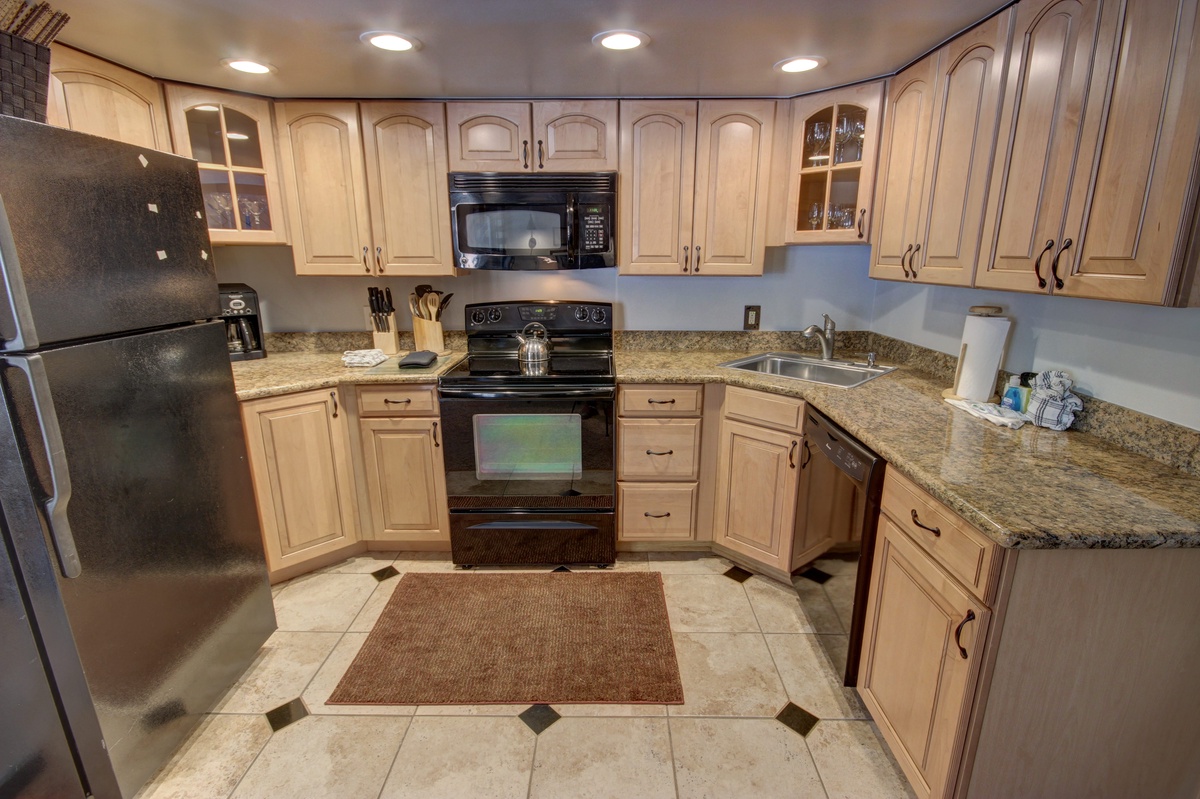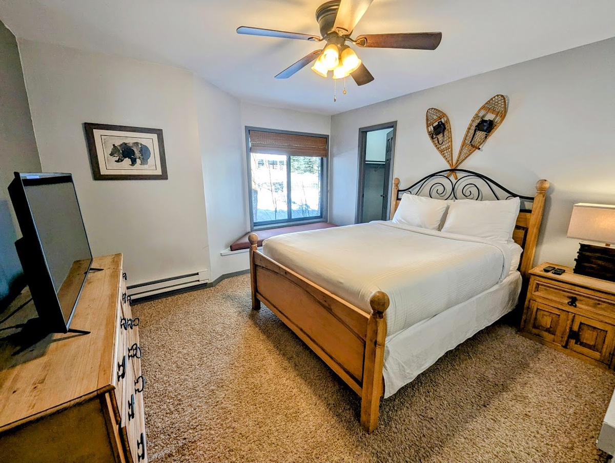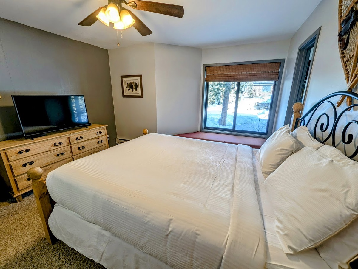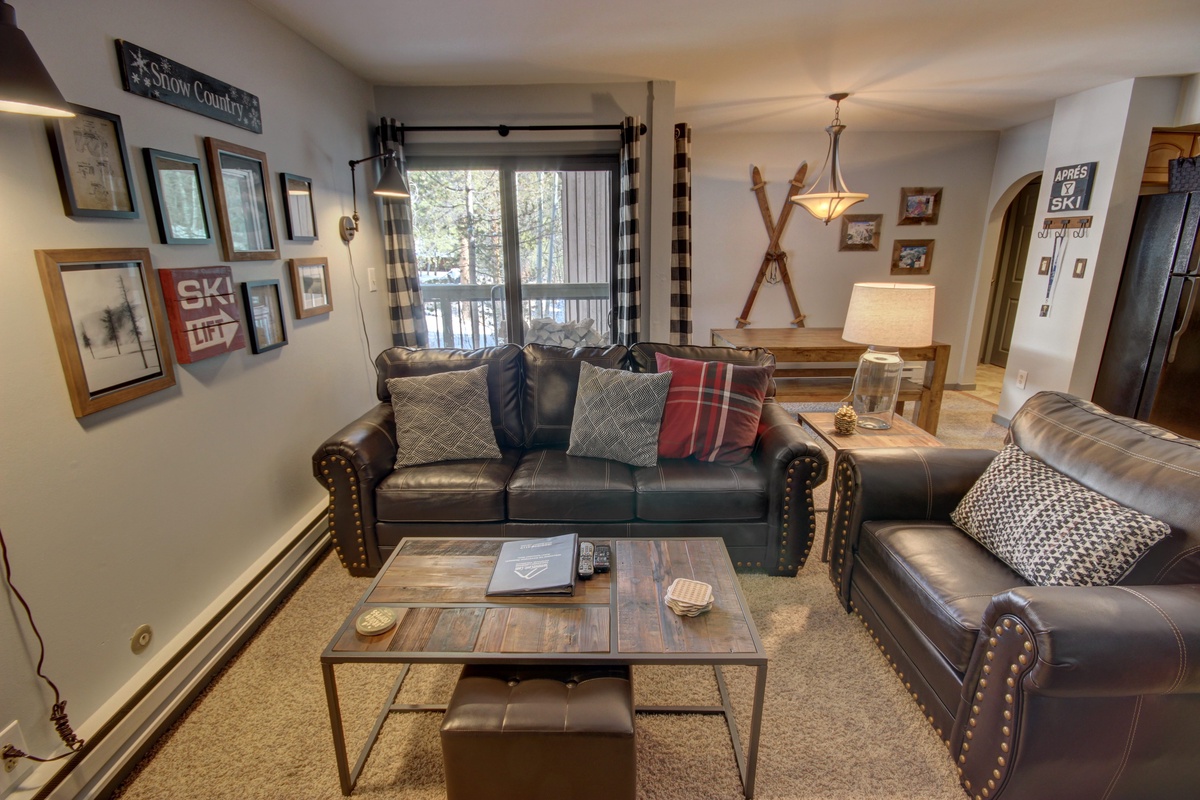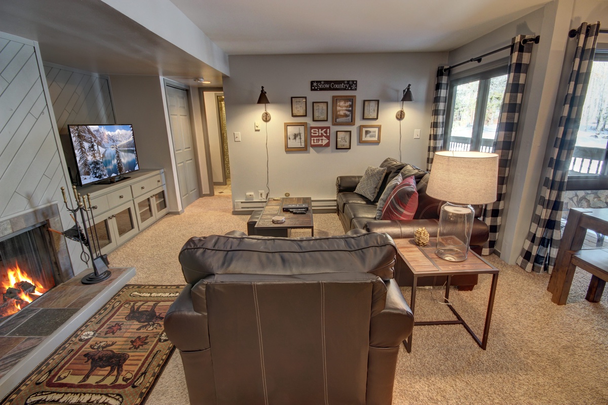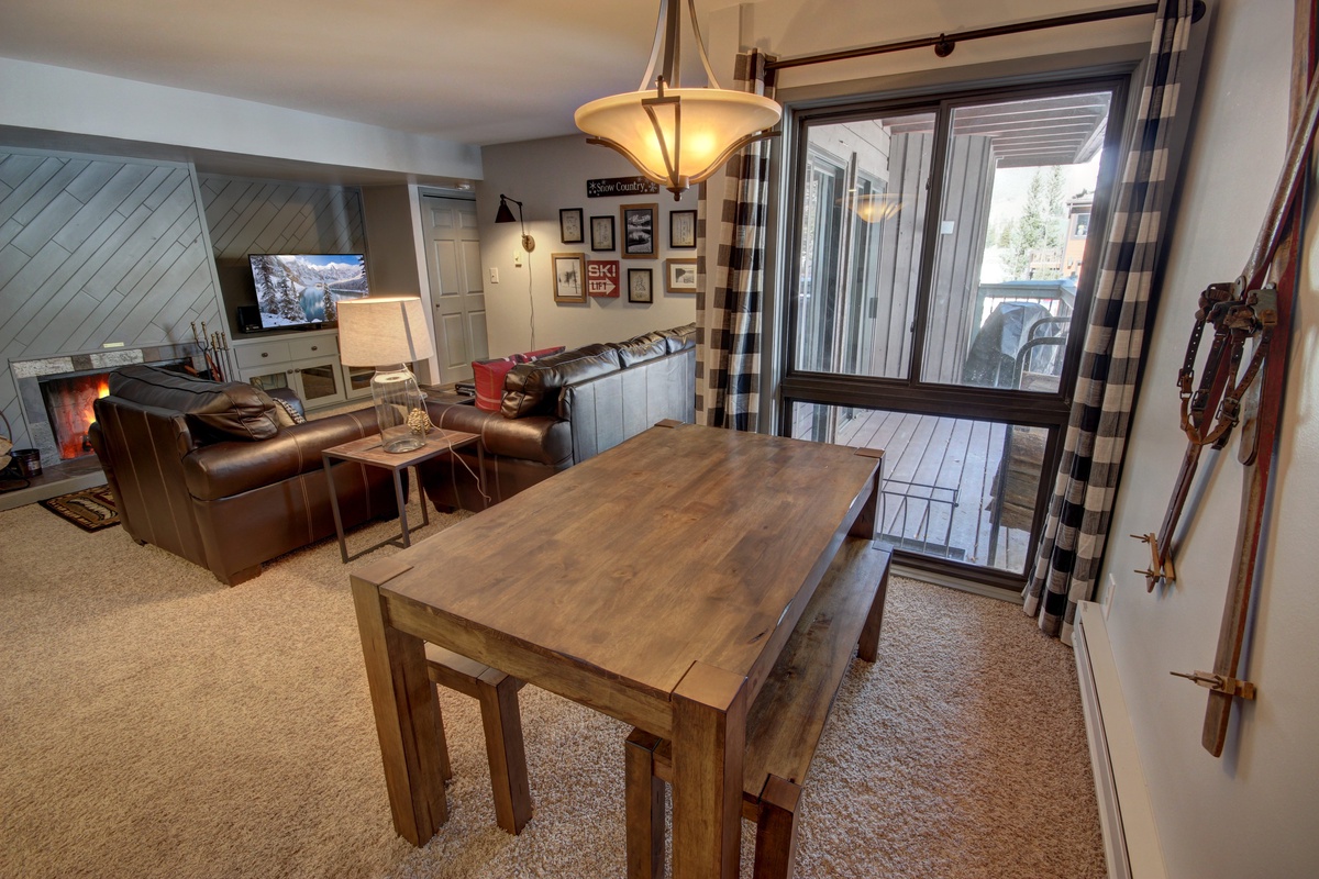 As you step into the condo, you'll immediately be greeted by warm and inviting interiors. The living area features comfortable seating, perfect for unwinding after a day on the slopes. Sit back and relax by the cozy fireplace, while enjoying panoramic views of the surrounding mountains through the floor-to-ceiling windows. The fully equipped kitchen offers all the amenities needed to prepare delicious meals, while a spacious dining area provides ample seating for everyone.